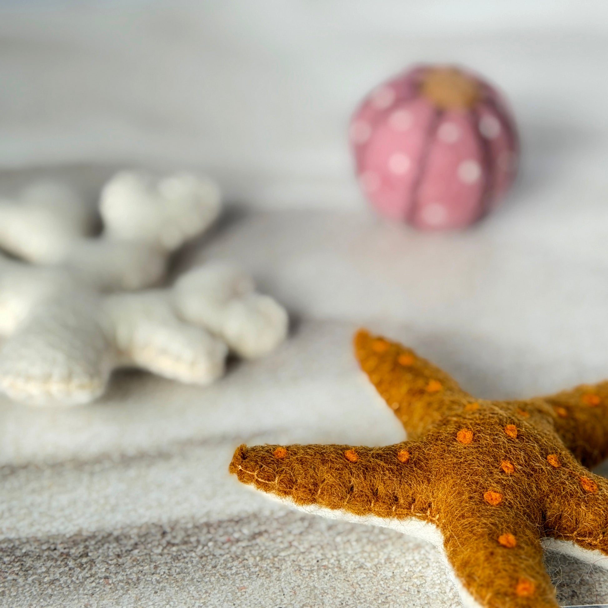 砂浜でスカウトしたカニが、友達を連れてきました。潮だまりの住人たち(ふじつぼ、サンゴ、ヒトデ、タツノオトシゴ)と一緒の、にぎやかな5点セット。カニの色は選べますが、友達の色は店長の気分次第。どんな組み合わせに出会えるかは、届いてからのお楽しみ。