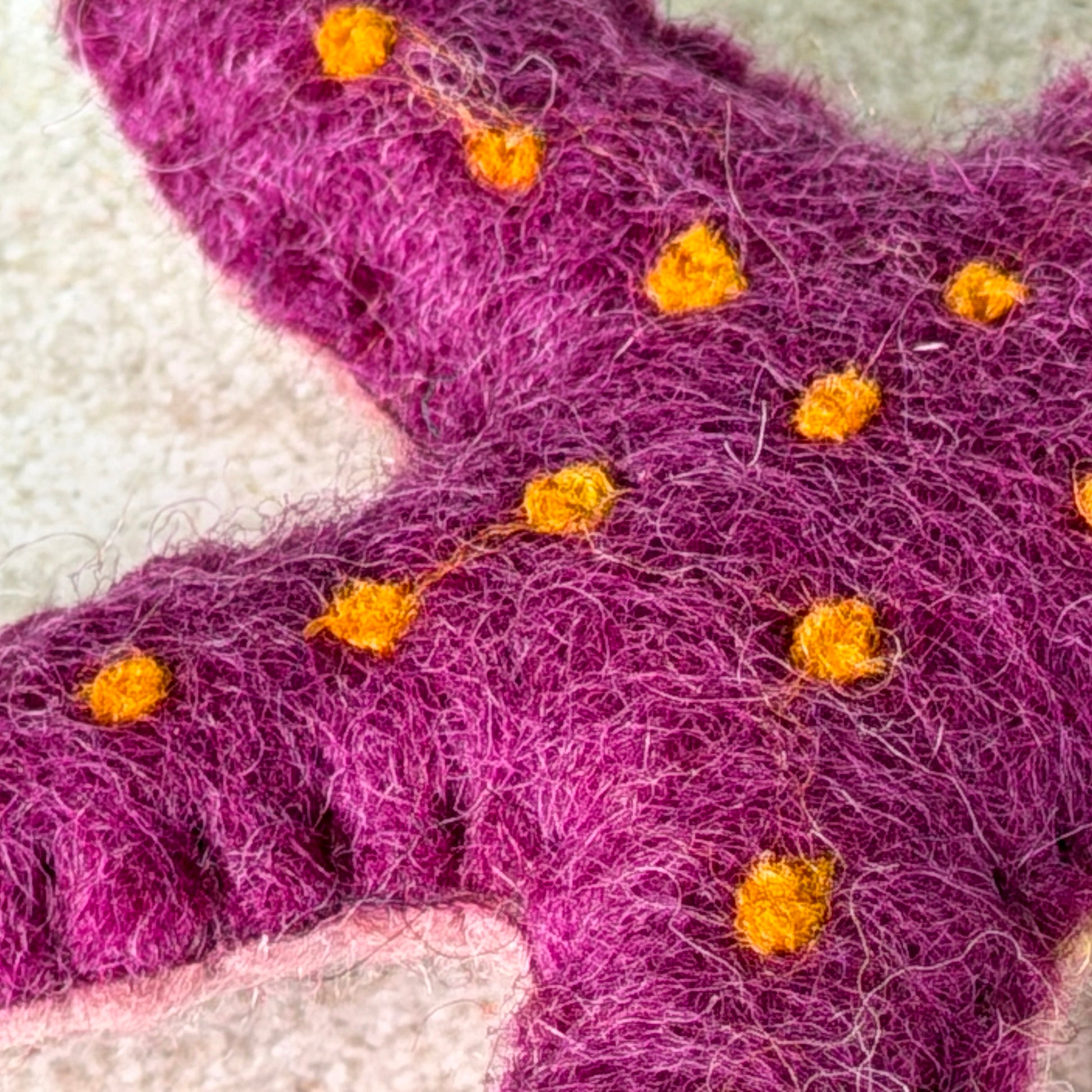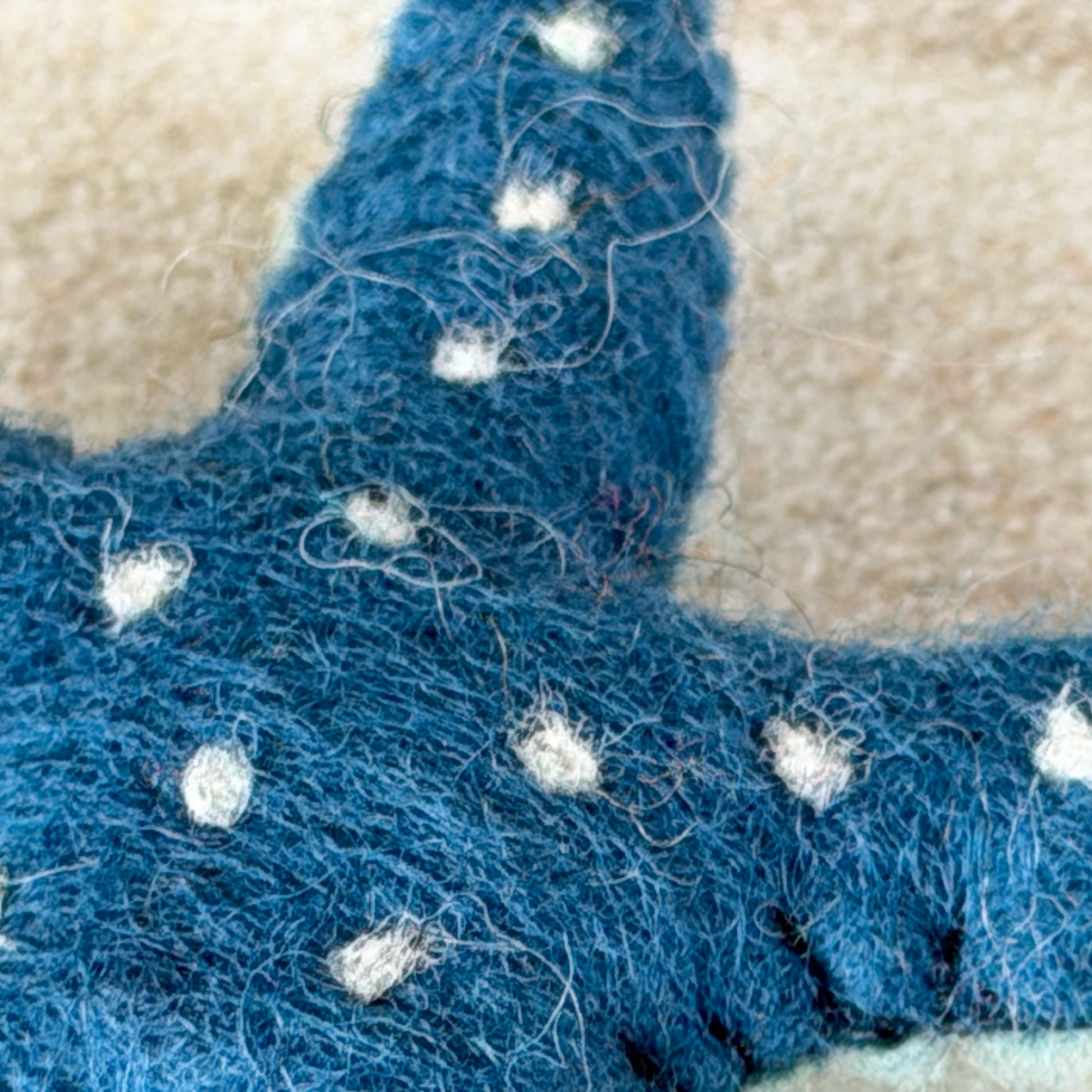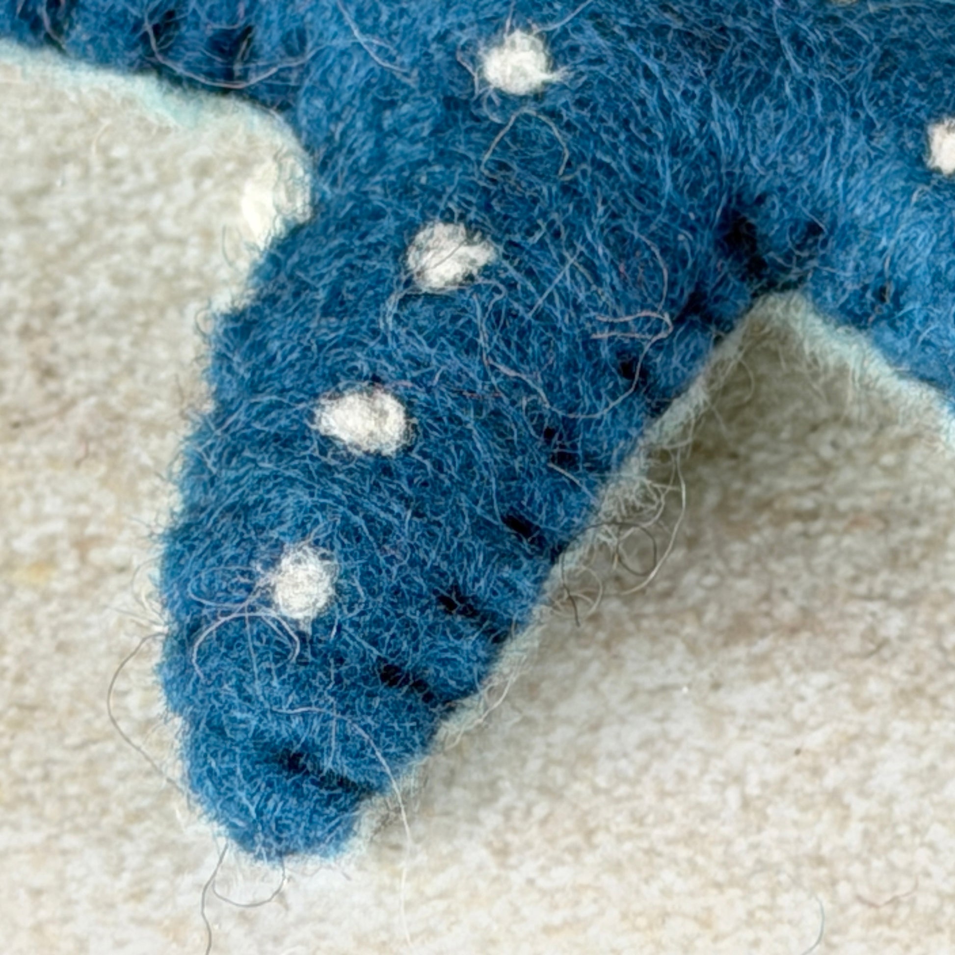 手作りの工芸品ですので、形や色が均一ではありません。また天然素材ならではの特徴として、黒い斑点や、染色前の白や黒の羊毛が混ざることがあります。遠くカトマンズの職人たちが込めた手仕事の温もりを、その個性とともにお楽しみいただける方におすすめします。