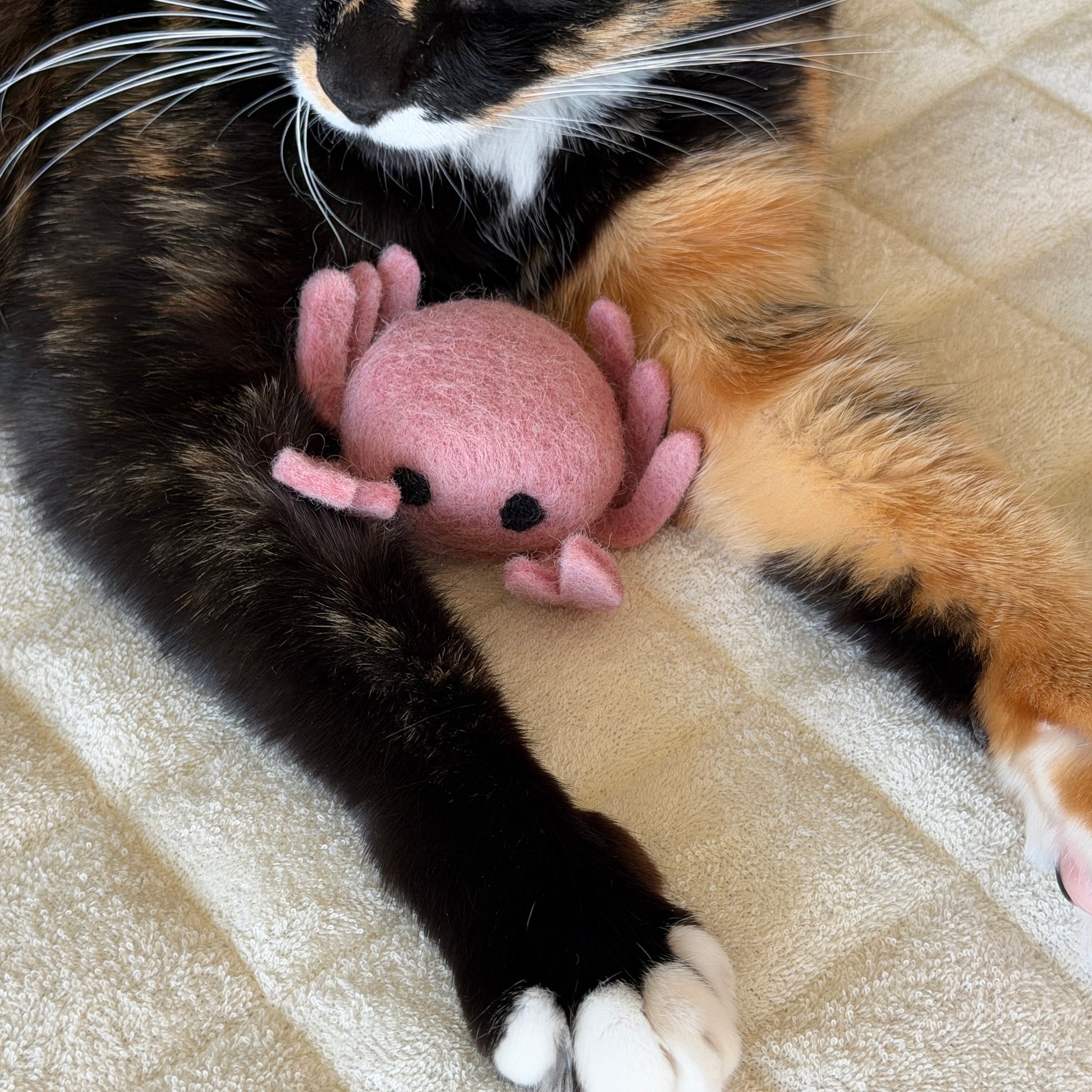 フェルトならではのしっかりとした作りは、ふわふわとした手触りはありませんが、ねこの大はしゃぎにも耐える丈夫さが魅力。噛みごたえも蹴りごたえも抜群と、店長からのお墨付きです。
