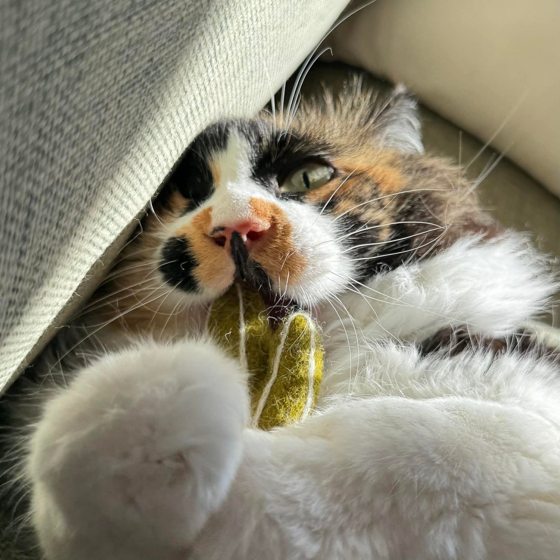 フェルトならではのしっかりとした作りは、ふわふわとした手触りはありませんが、ねこの大はしゃぎにも耐える丈夫さが魅力。噛みごたえも蹴りごたえも抜群と、店長からのお墨付きです。