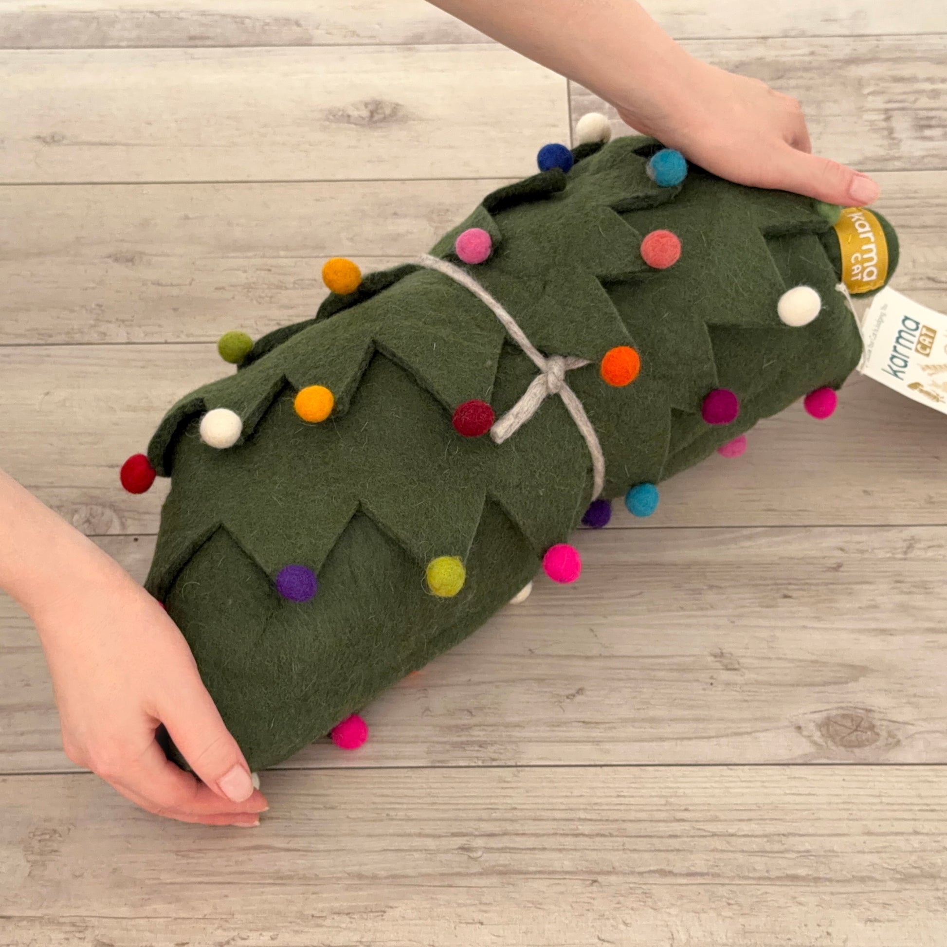 クリスマスの準備も、ねこの居場所作りも、これ一つで解決。グリーンのツリーに、カラフルなフェルトボールが楽しいホリデーちぐらです。ウールフェルト100%で作られた、ねこの大好きな狭さと暗さ。これをひとつ置けば、クリスマスムードも高まって一石二鳥です。全てのパーツが手縫いで、プラスチック、ワイヤー、接着剤を一切使っていません。ねこはもちろん、小型犬にもお勧めです。