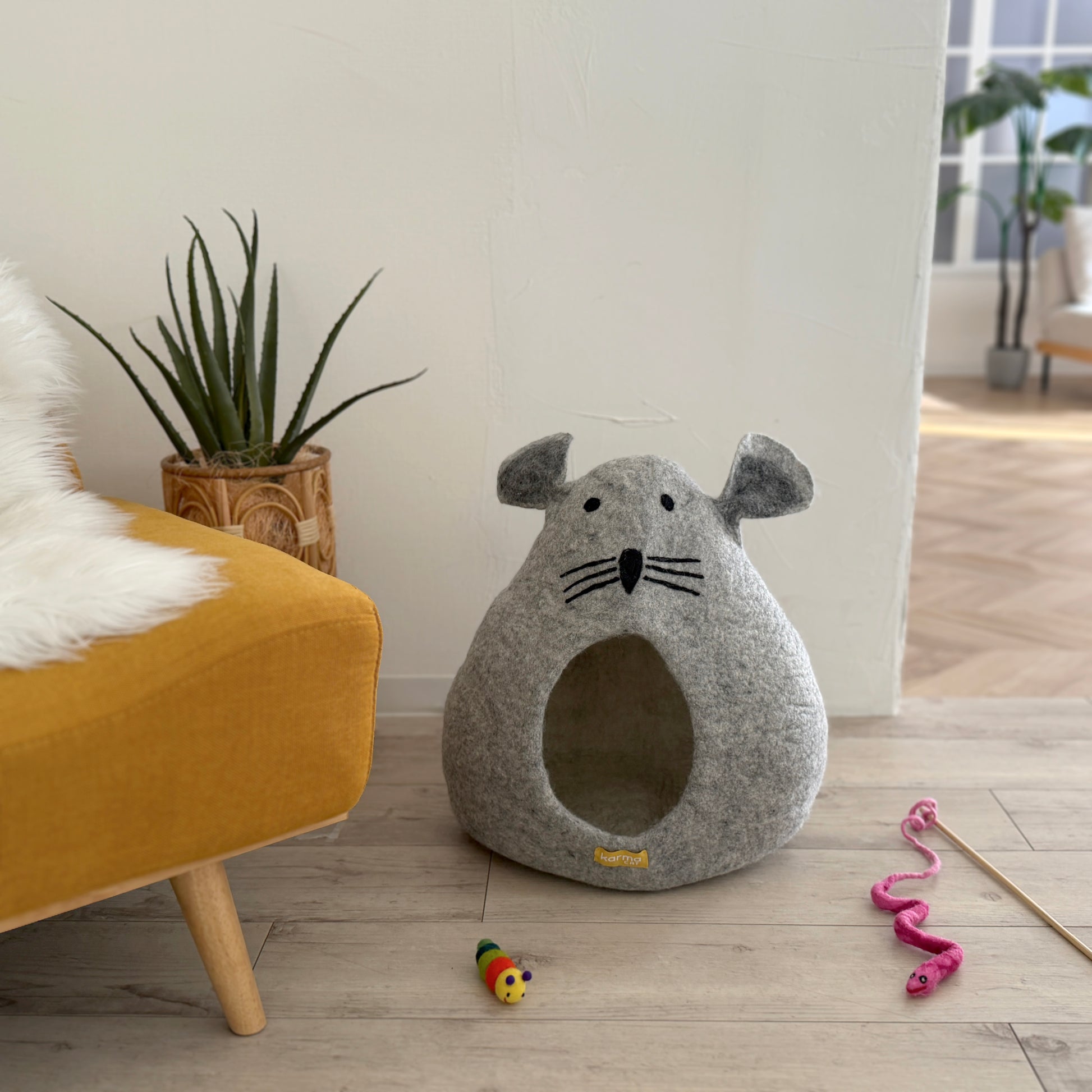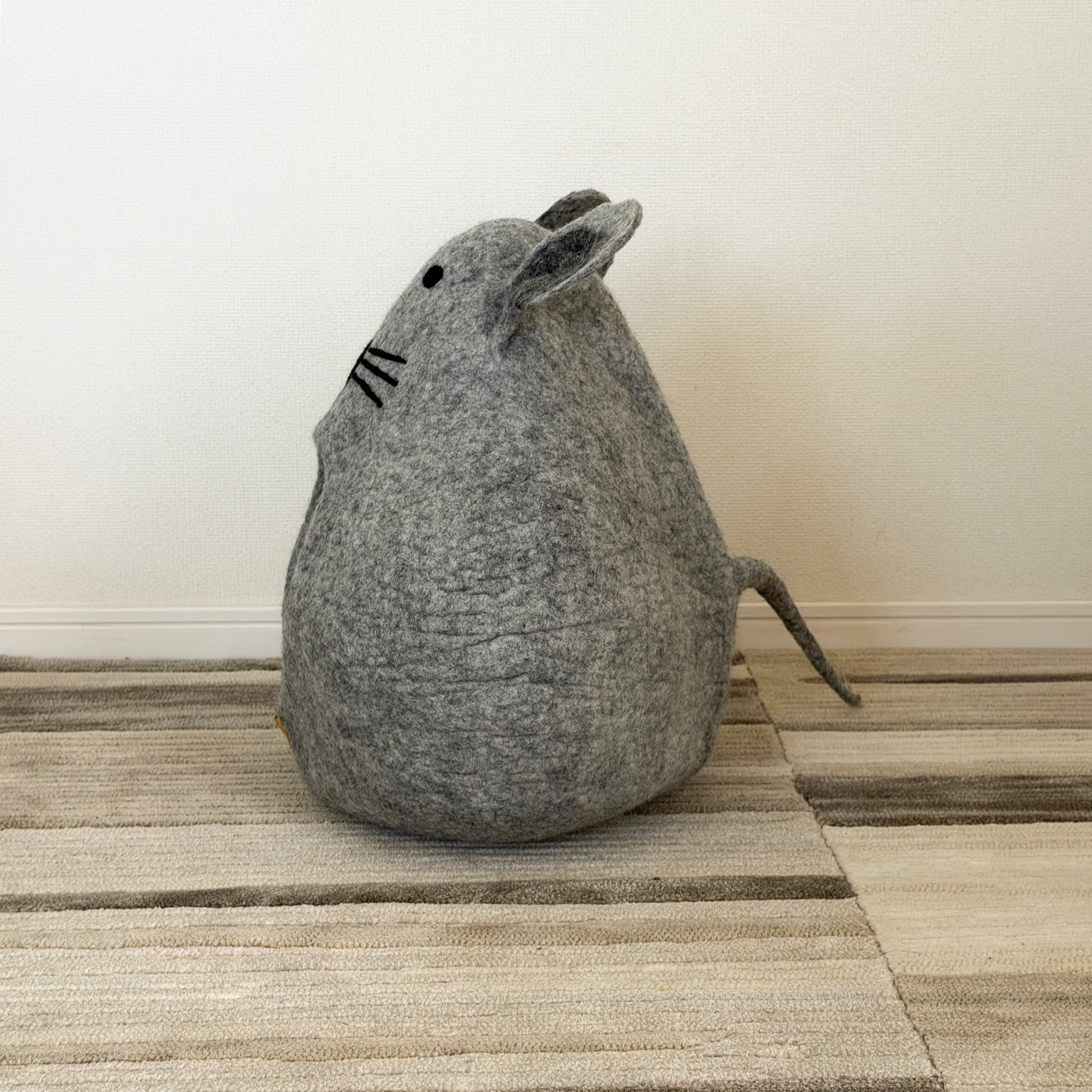 シックなグレーのネズミ型ちぐら。ウールフェルト100%の上質なくつろぎ空間を、ねこがネズミの中でくつろぐというシュールさと共に。程よい密閉感と暗さは、ねこの安心感を満たします。冬の寒さから守り、夏はクーラーの風を遮る理想的な隠れ家。熟練の職人による手仕事で、プラスチック、ワイヤー、接着剤を一切使っていません。小さなわんこにもお勧めです。