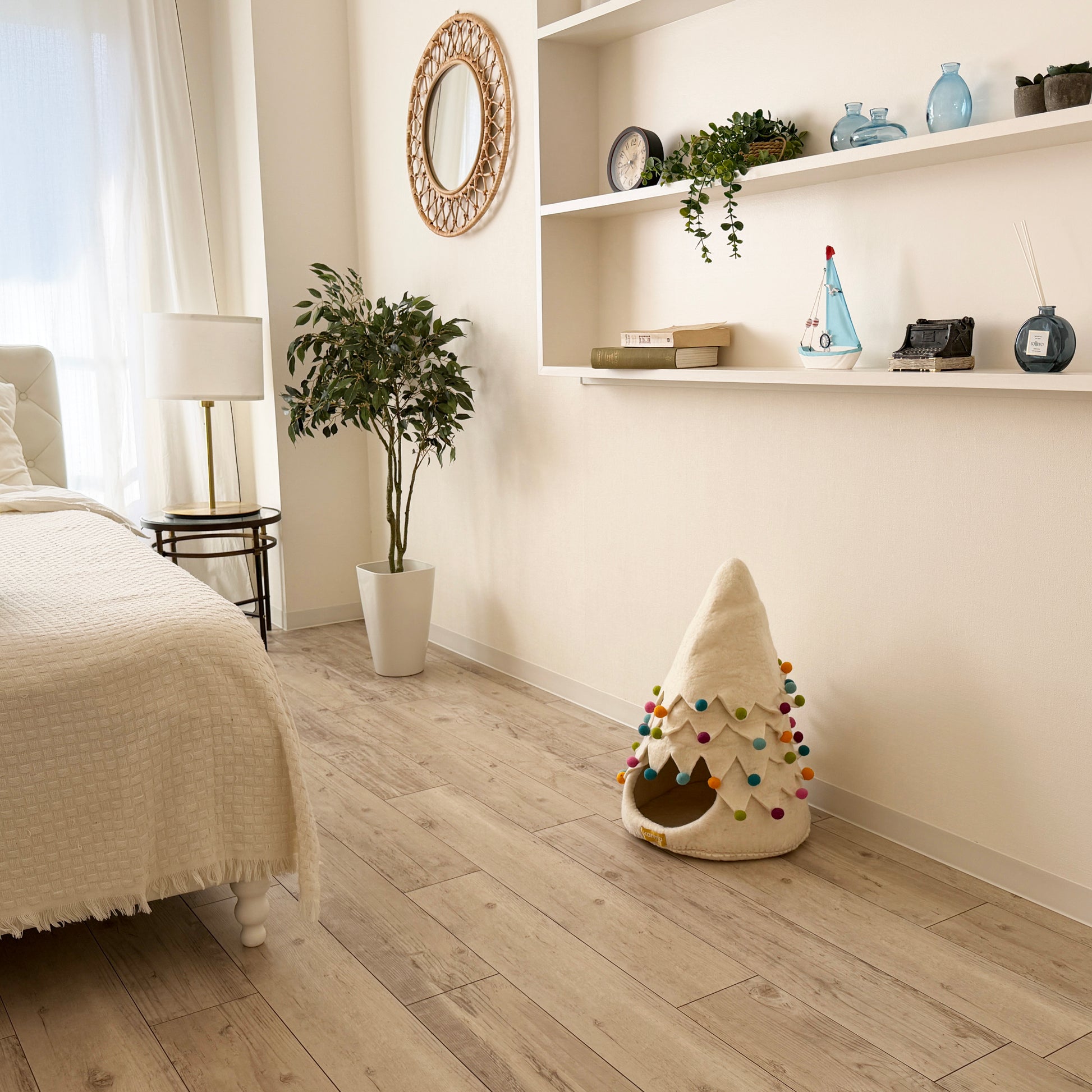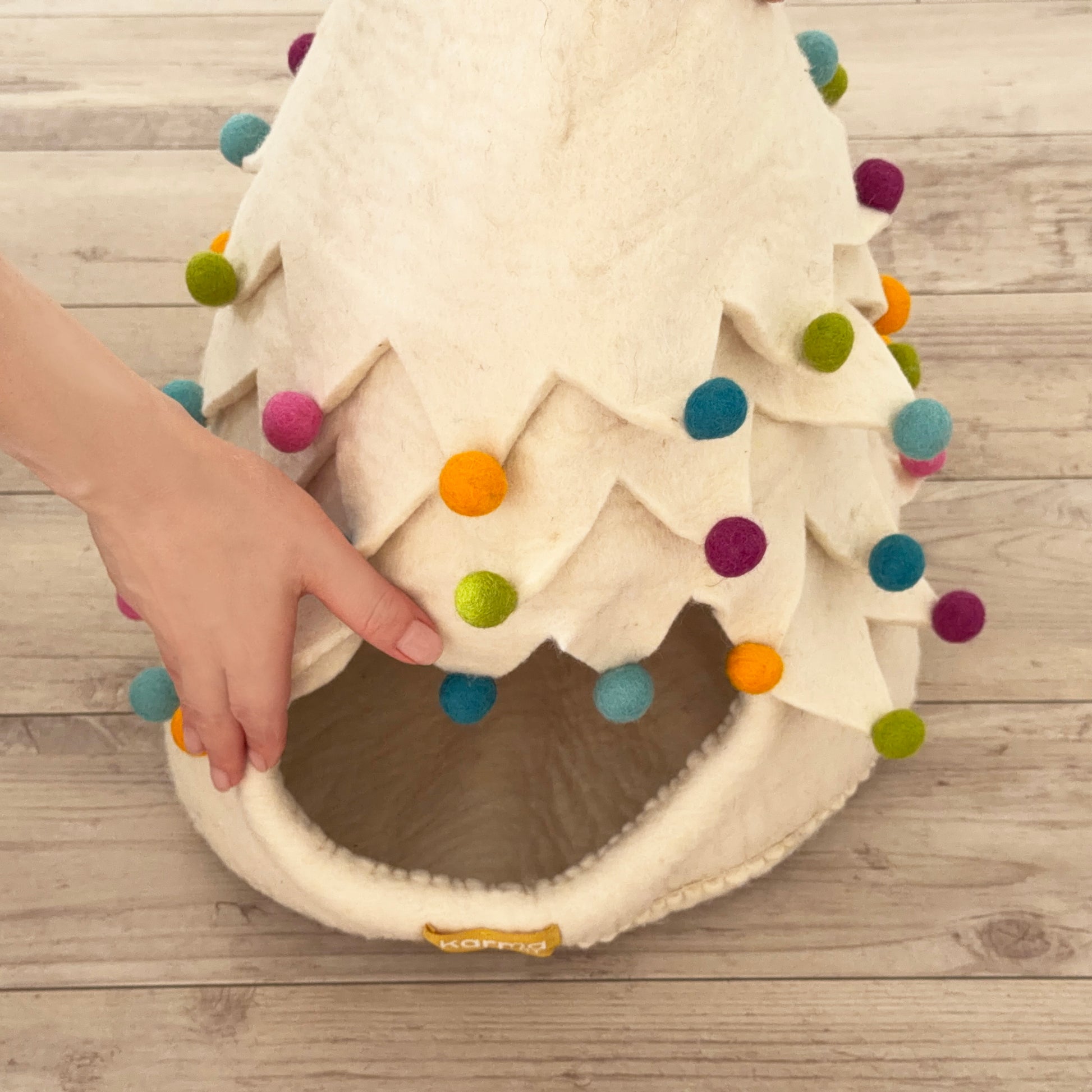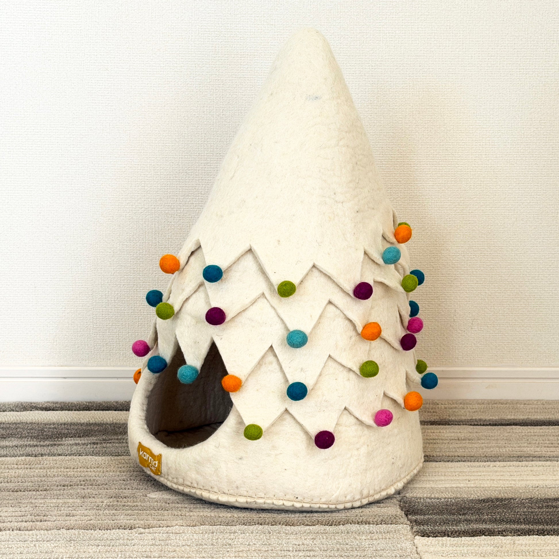 グリーンのツリーも素敵だけど、こちらは一味違います。白い雪をまとったツリーのような、幻想的なホワイトクリスマスちぐら。カラフルなフェルトボールは、冬の妖精が散りばめた宝石のよう。クリスマスシーズンはもちろん、冬のインテリアとしても違和感なく飾れるデザインです。上質なウールフェルト100%で仕立てた、程よい狭さと暗さがねこのお気に入りに。プラスチックやワイヤー、接着剤不使用の安心設計。小さなわんこにもお使いいただけます。