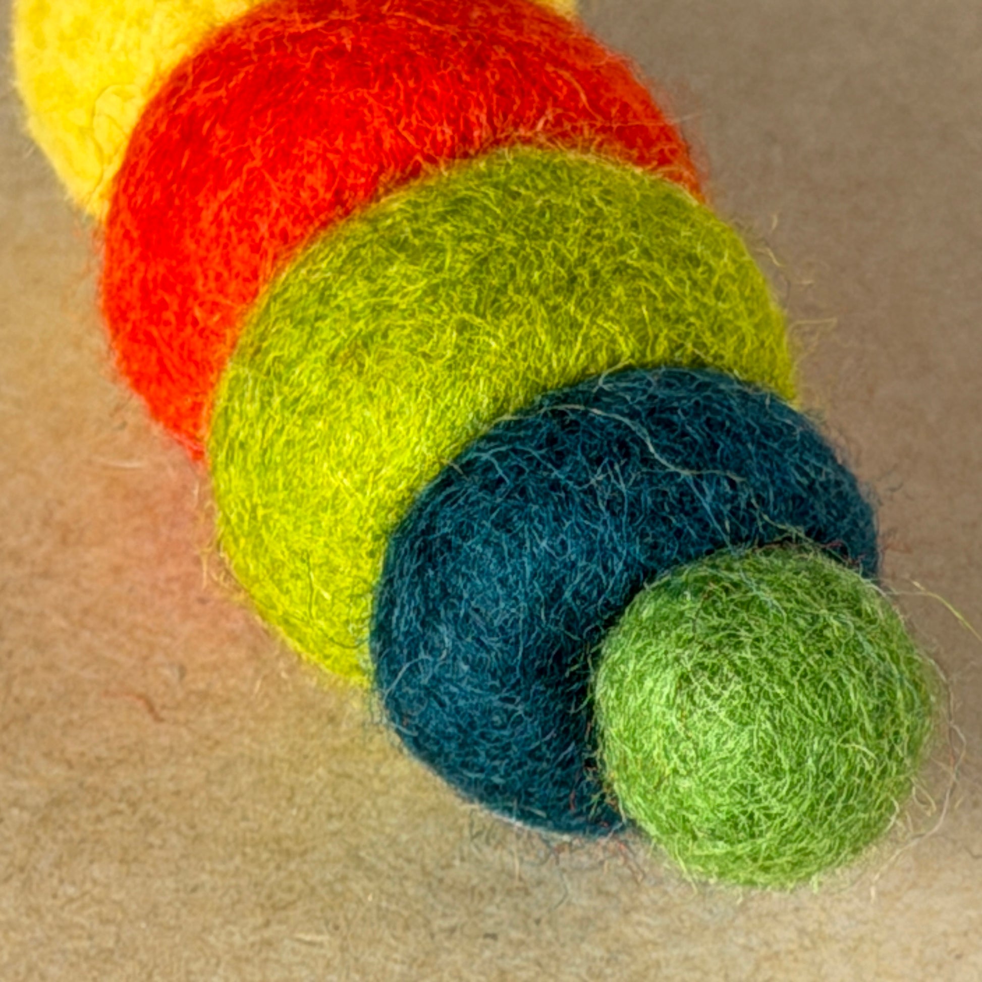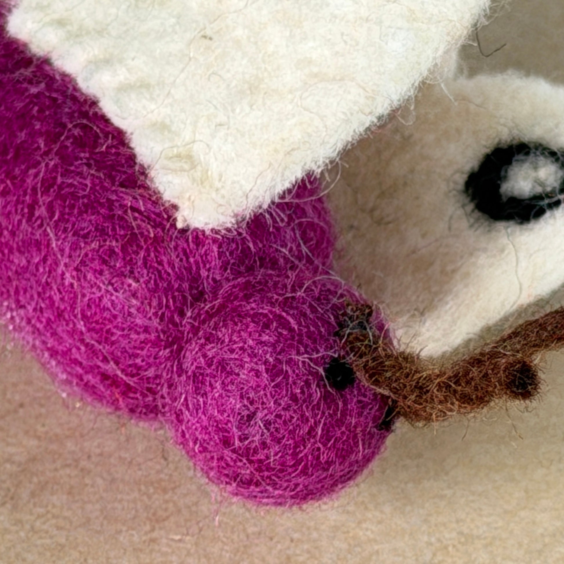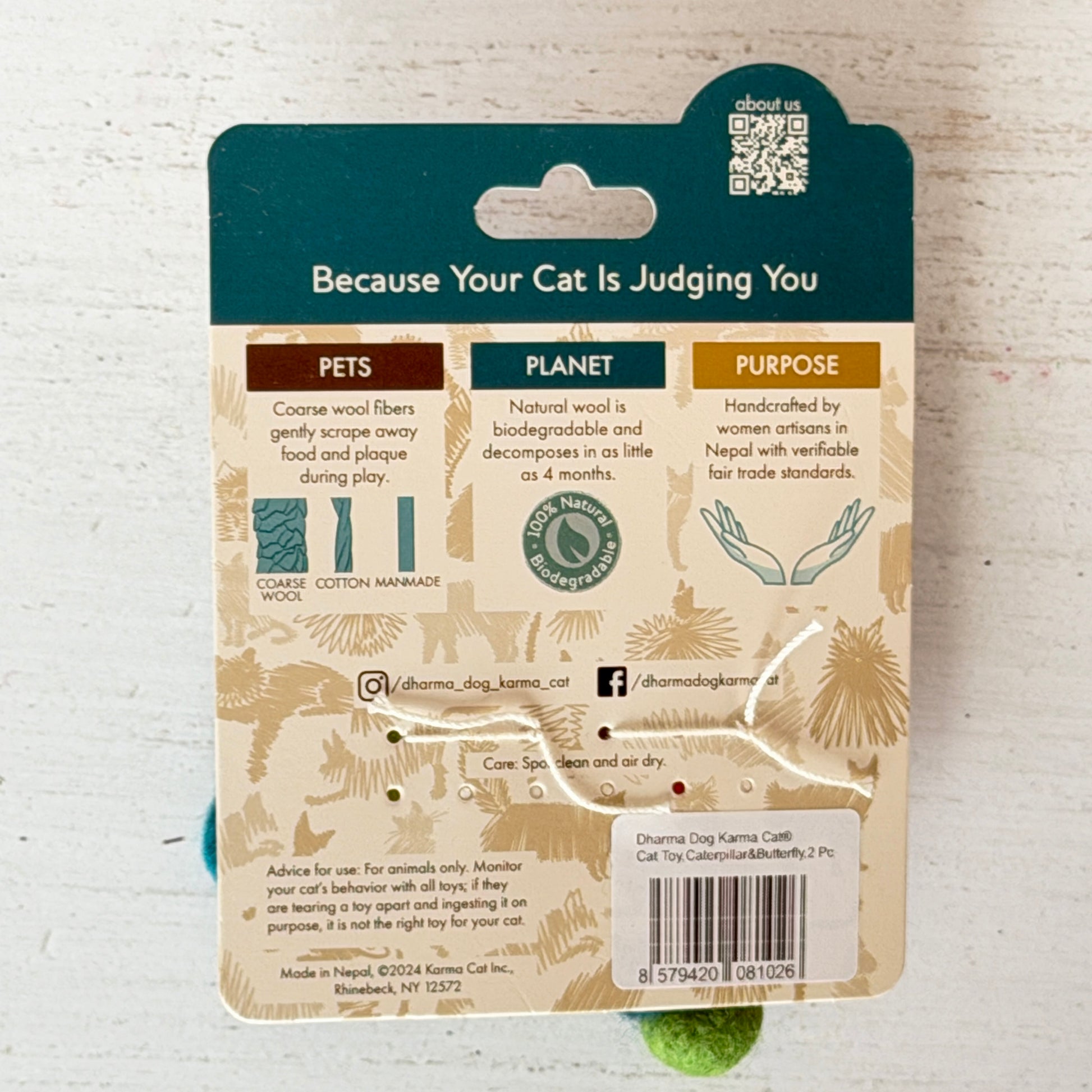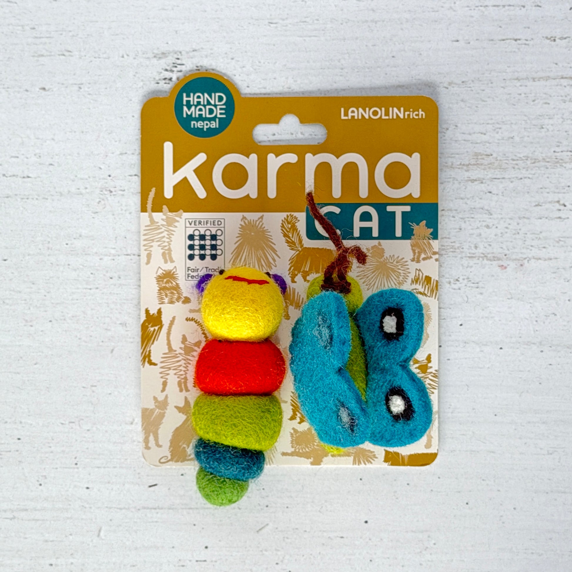 Karma Cat は、ヒマラヤとニュージーランドの厳選羊毛をブレンドした、ウールフェルト100%のねこのためのおもちゃブランドです。一般的なおもちゃでは中綿にポリエステルを使用することが多い中、Karma Cat の商品は中まで全てフェルト。ネパールの熟練職人がひとつずつ、丁寧に手作りしています。