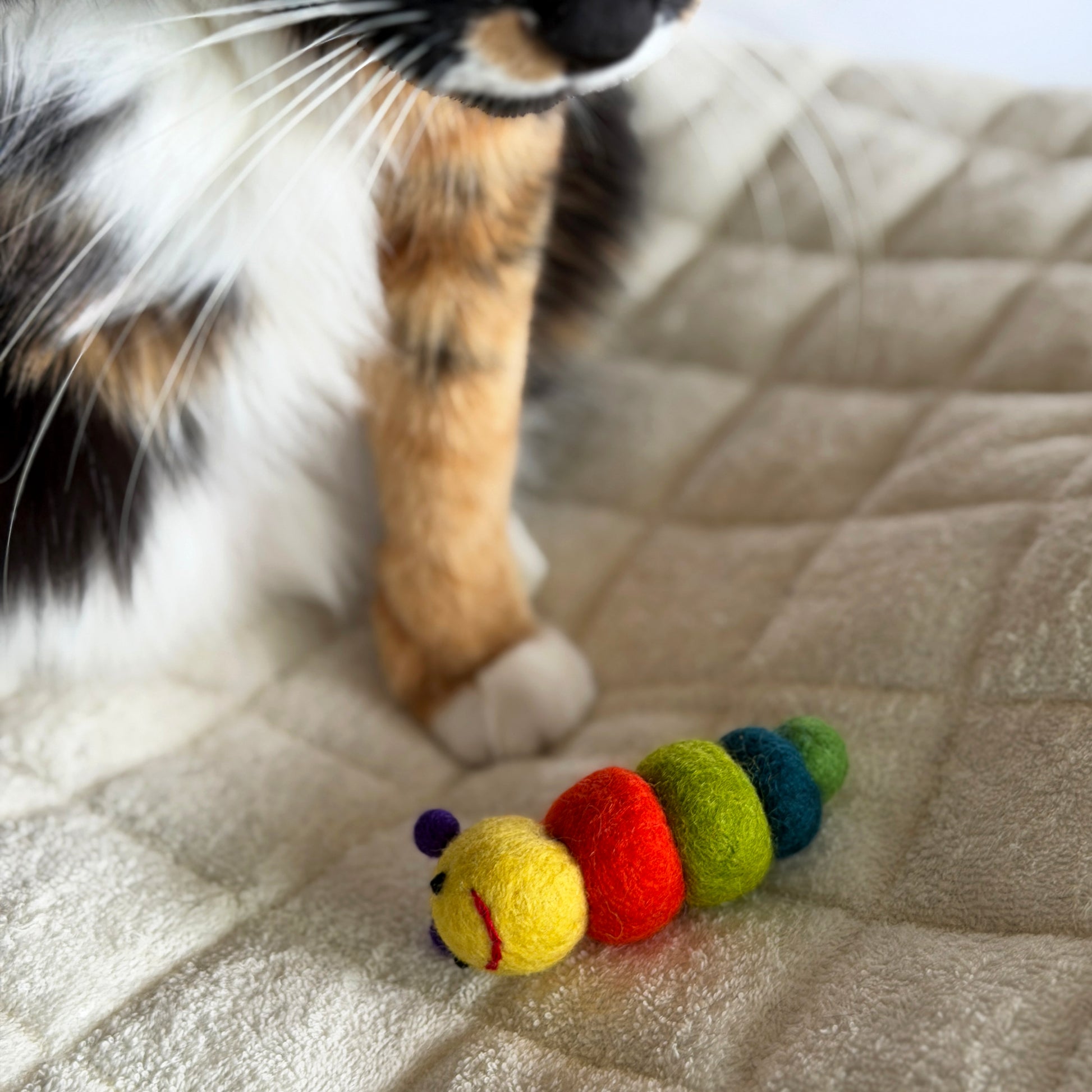 フェルトならではのしっかりとした作りは、ふわふわとした手触りはありませんが、ねこの大はしゃぎにも耐える丈夫さが魅力。噛みごたえも蹴りごたえも抜群と、店長からのお墨付きです。
