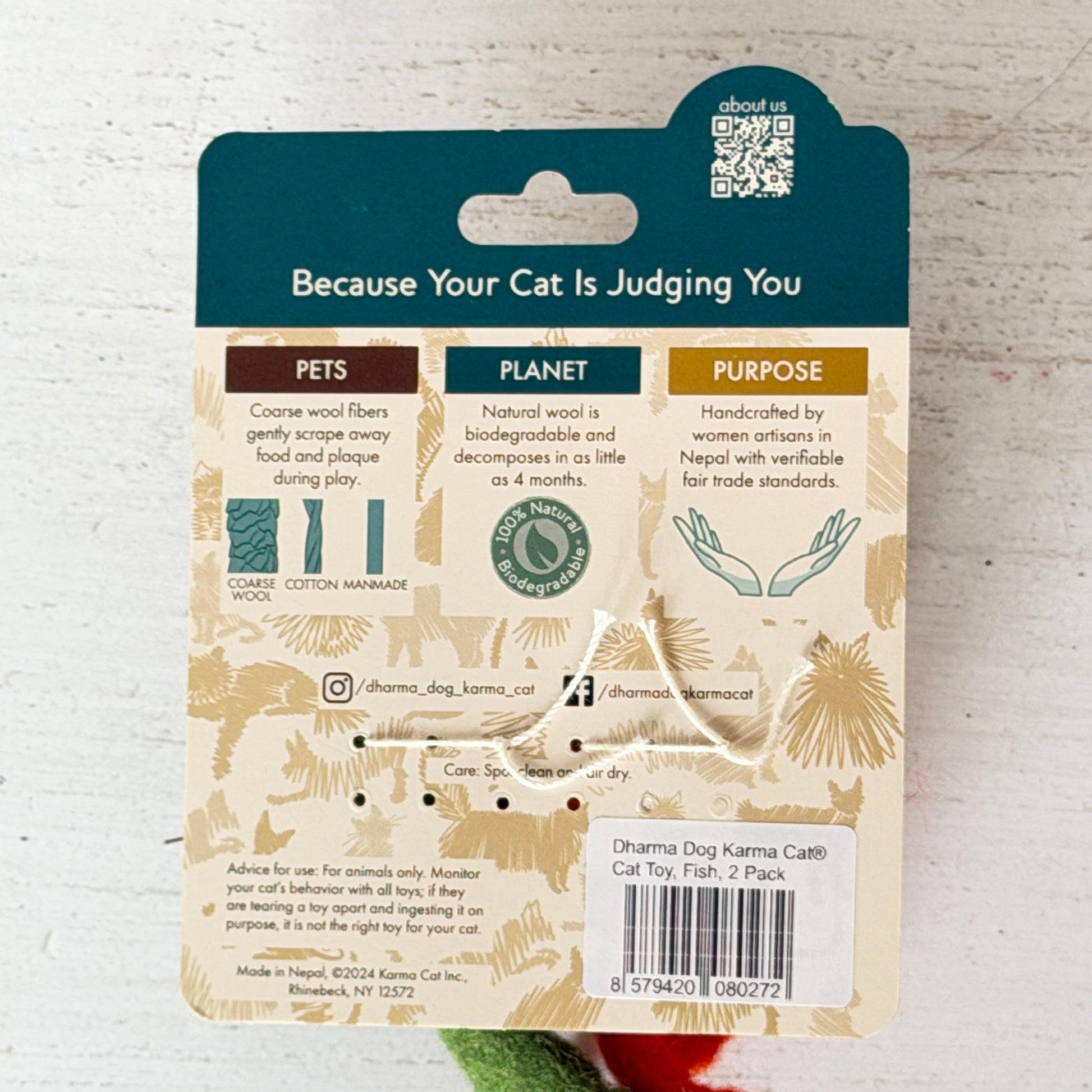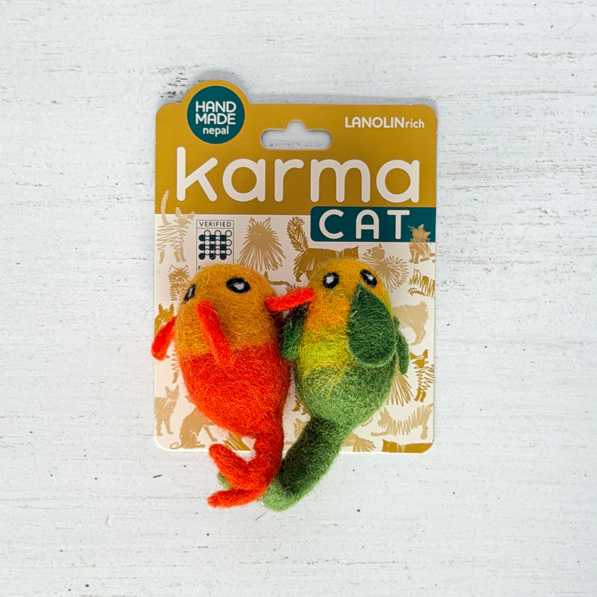 Karma Cat は、ヒマラヤとニュージーランドの厳選羊毛をブレンドした、ウールフェルト100%のねこのためのおもちゃブランドです。一般的なおもちゃでは中綿にポリエステルを使用することが多い中、Karma Cat の商品は中まで全てフェルト。ネパールの熟練職人がひとつずつ、丁寧に手作りしています。