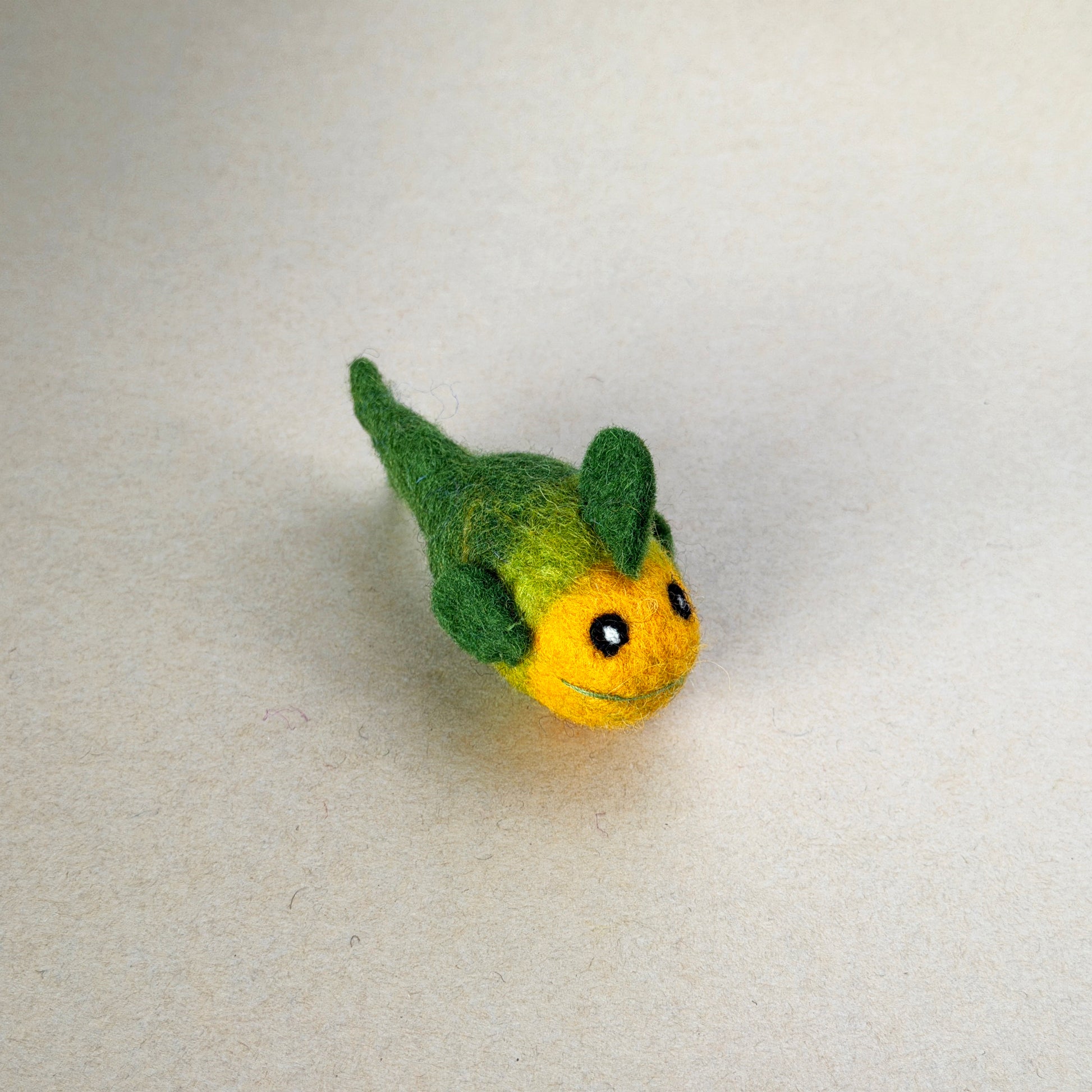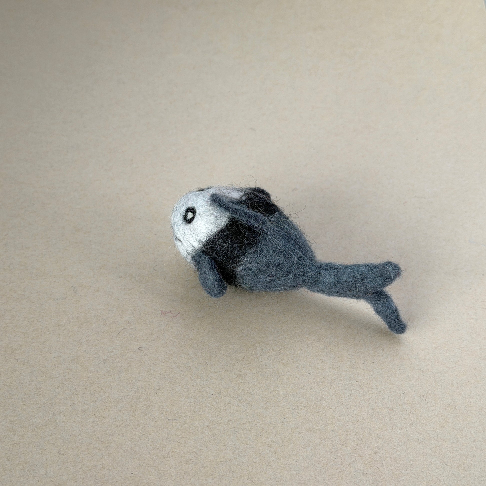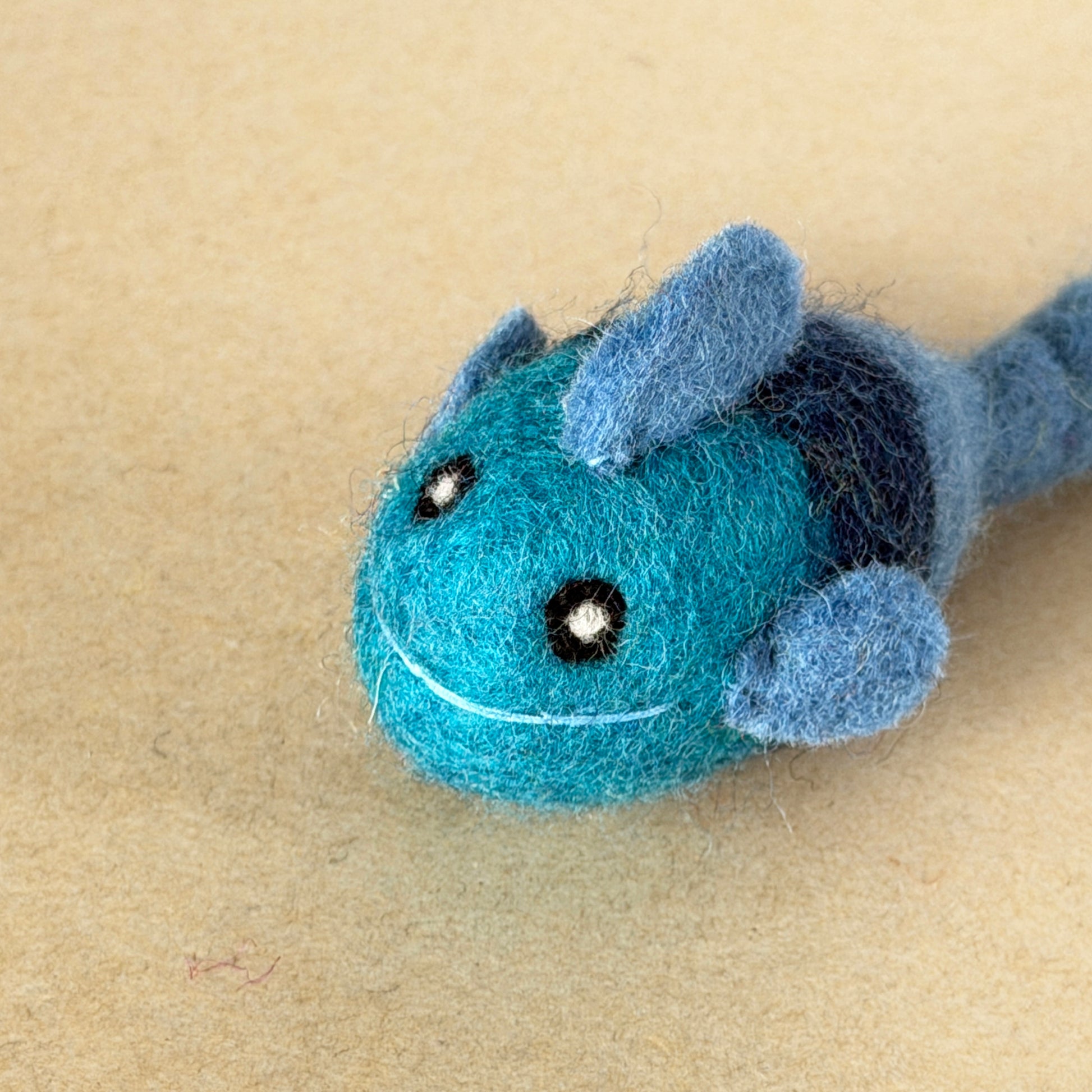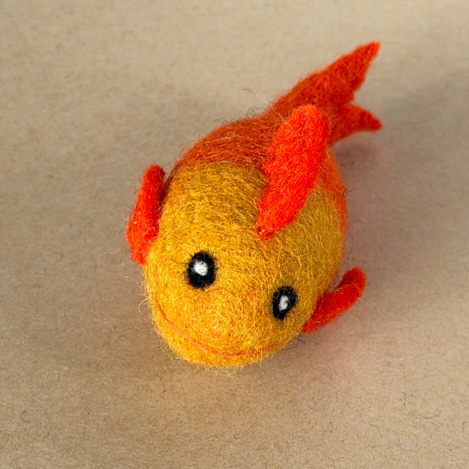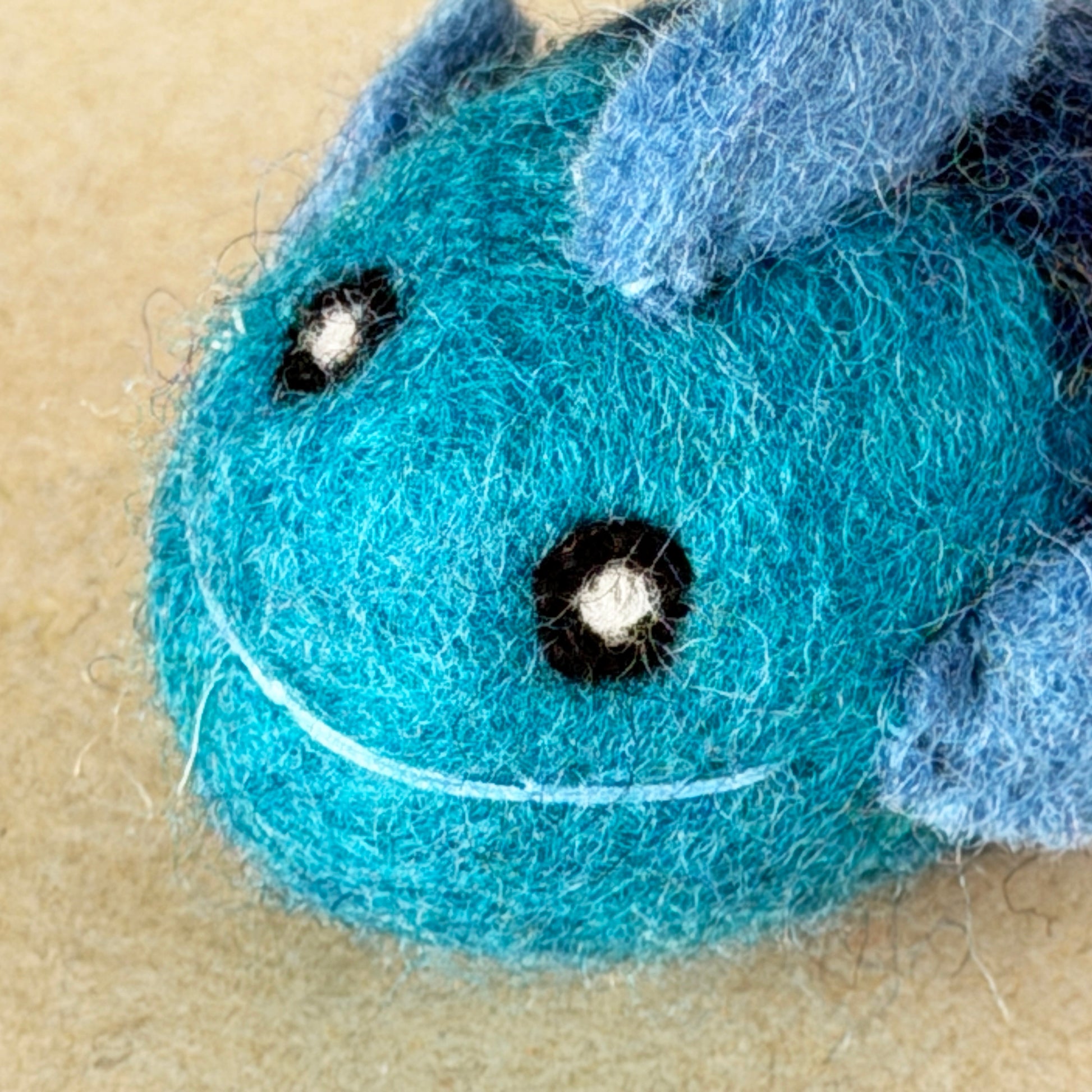 ジューシーなお魚の2匹セットです。ぜいたくなことにお腹の中までフェルトでいっぱいですので、泳げないかもしれません。目もビーズではなくフェルト。ヒレは接着剤を使わずしっかり縫い付けてあります。カラーはおまかせとなりますが、どの組み合わせもジューシーな仕上がりです。カラフルな魚を1匹ずつ選びたい方はこちらです。