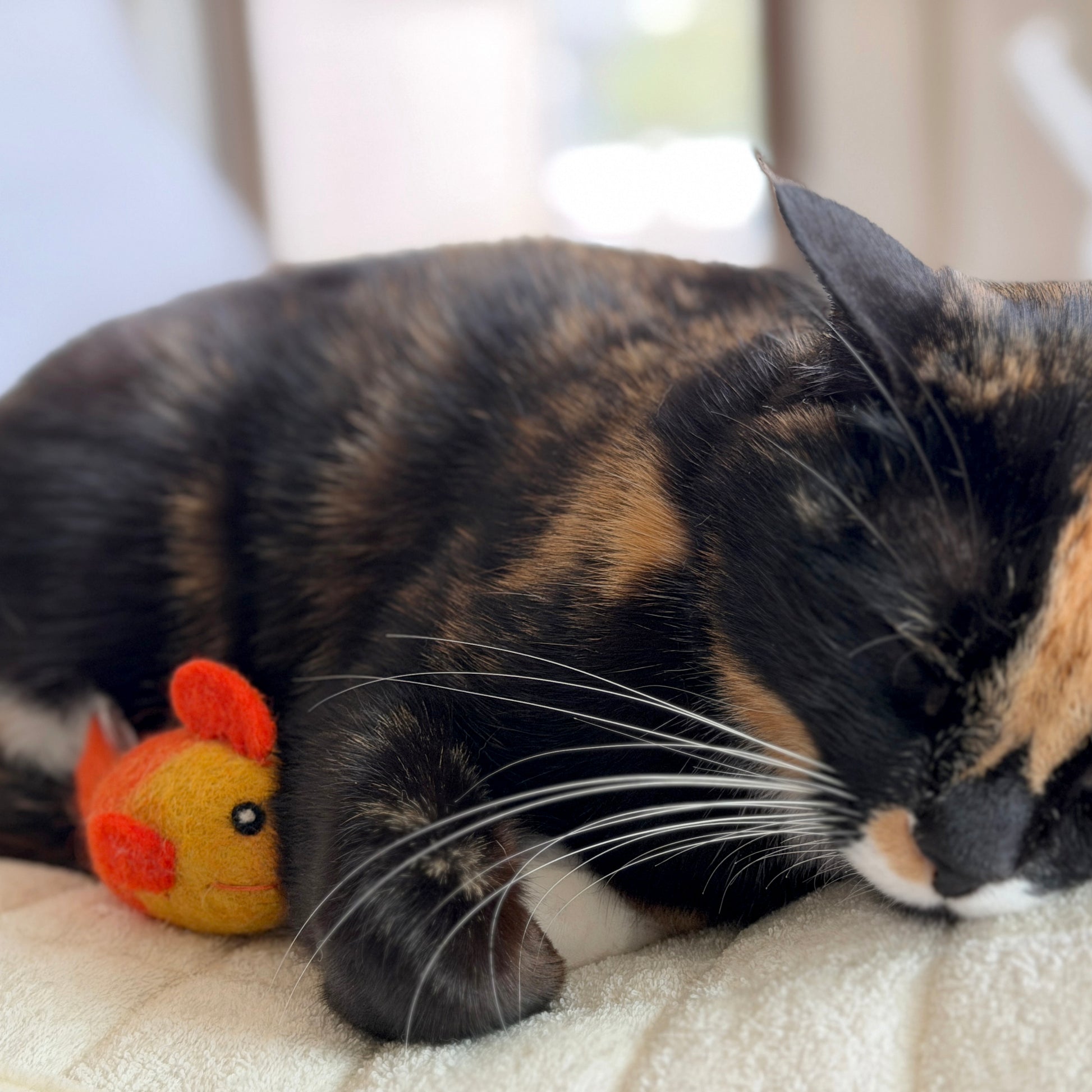 フェルトならではのしっかりとした作りは、ふわふわとした手触りはありませんが、ねこの大はしゃぎにも耐える丈夫さが魅力。噛みごたえも蹴りごたえも抜群と、店長からのお墨付きです。