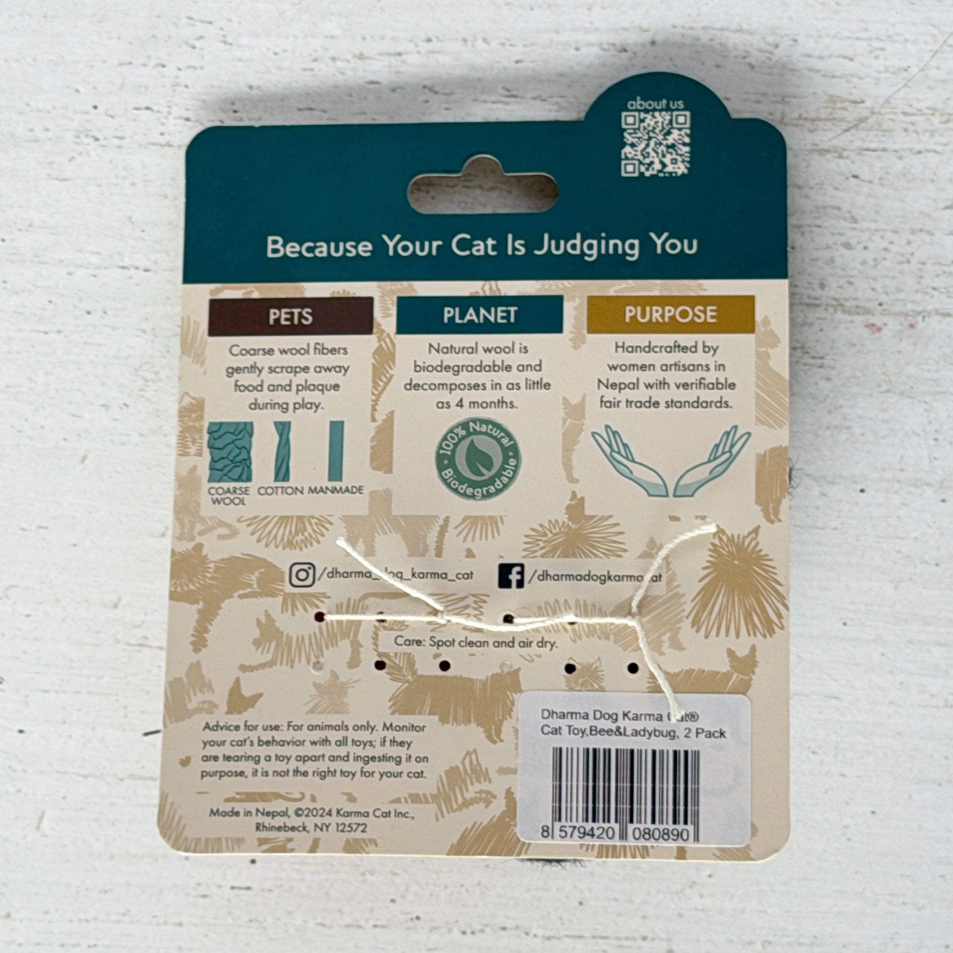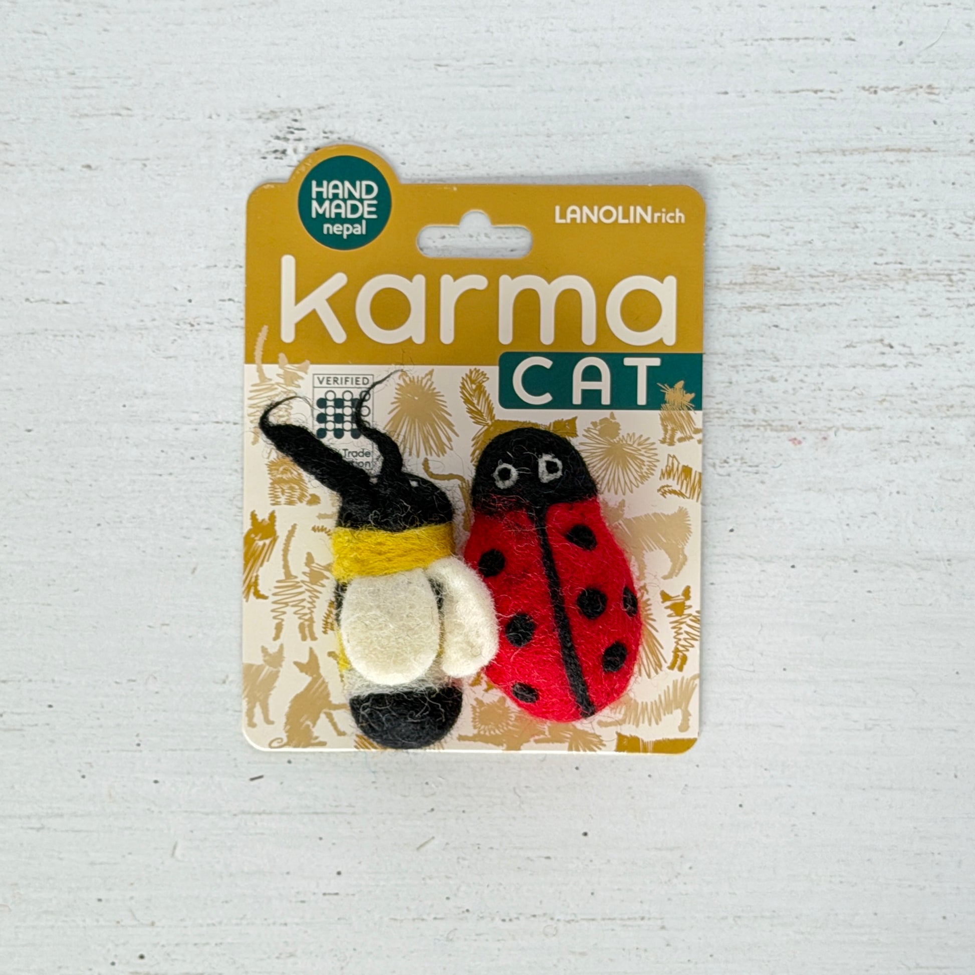 Karma Cat は、ヒマラヤとニュージーランドの厳選羊毛をブレンドした、ウールフェルト100%のねこのためのおもちゃブランドです。一般的なおもちゃでは中綿にポリエステルを使用することが多い中、Karma Cat の商品は中まで全てフェルト。ネパールの熟練職人がひとつずつ、丁寧に手作りしています。