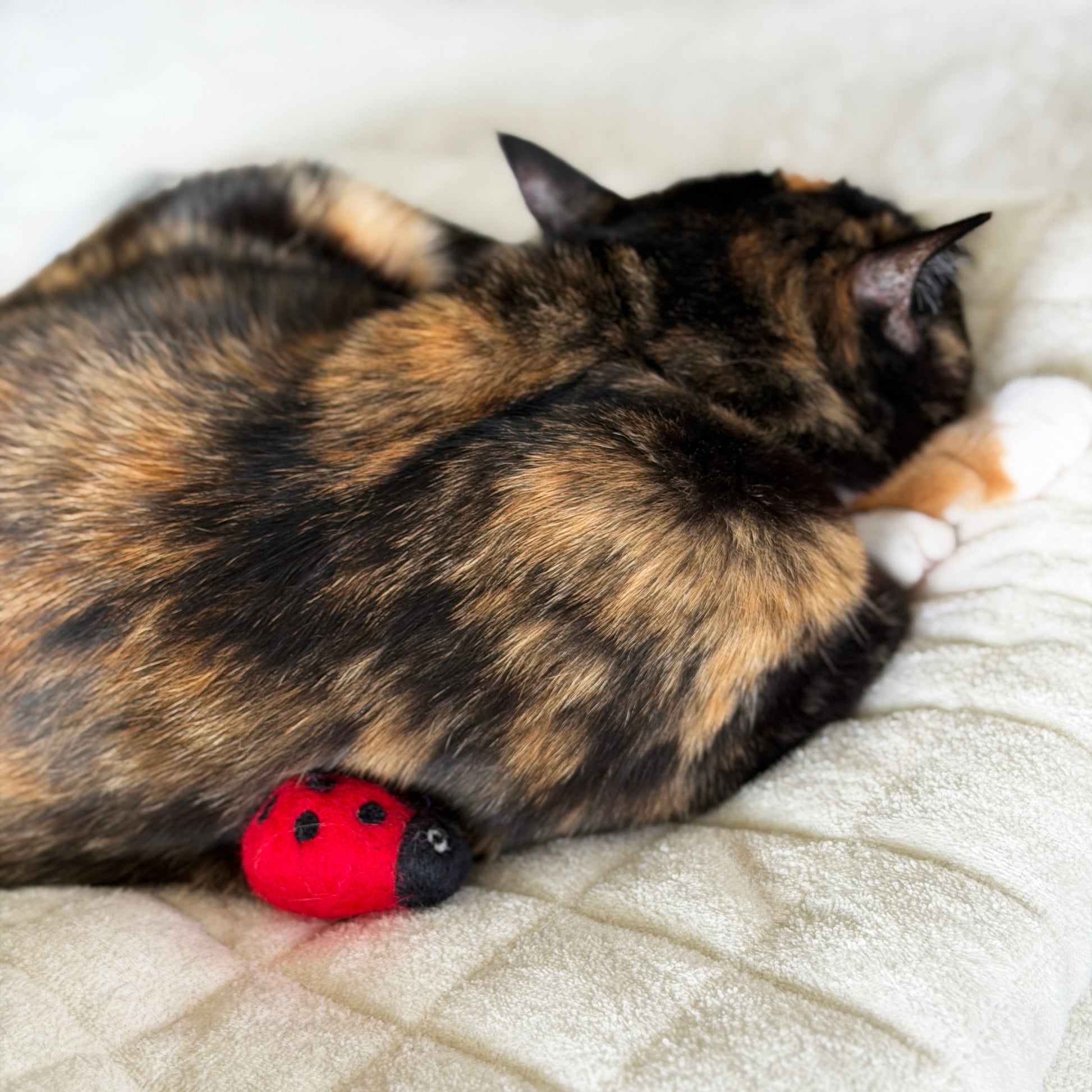 縁起物コンビ、ミツバチとてんとう虫のラッキーペア。小さめで丸っこいので、転がして遊ぶのにぴったりです。でもね、本当のラッキーチャームは、あなたの大好きなモフモフかもしれません。