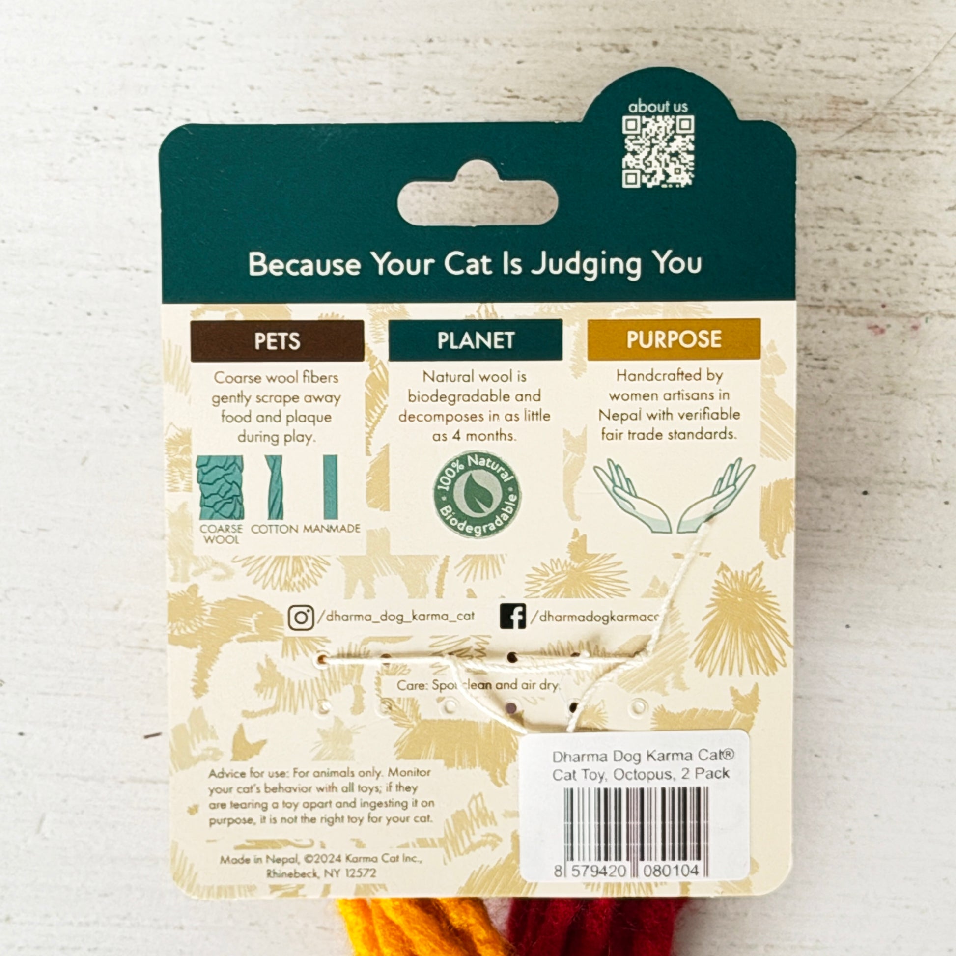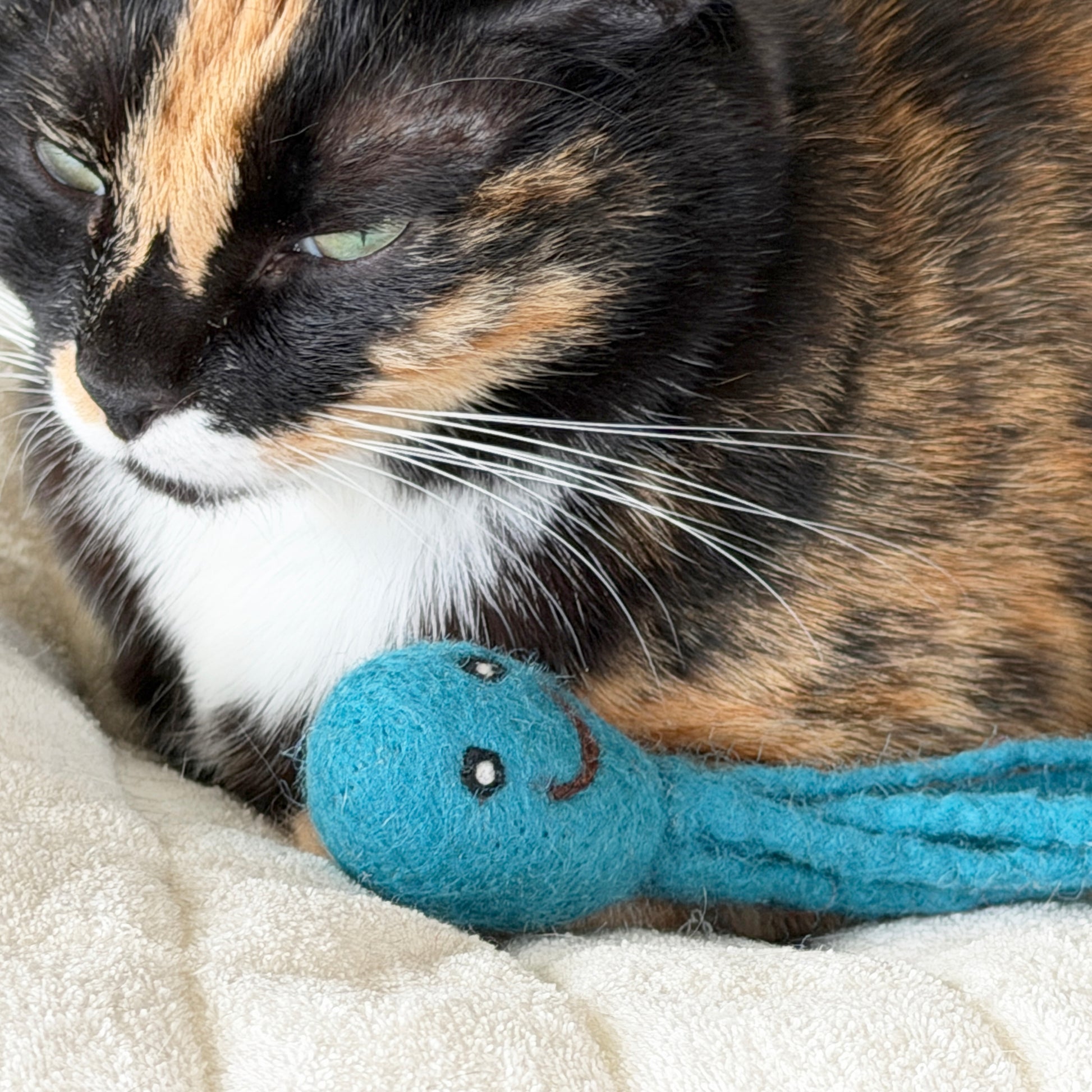 カラフルなタコの2匹セットです。チャームポイントは、かじるのに最適なヒョロヒョロした足。本物のタコは捕まえられなくても、このタコなら得意のハンティングを存分に楽しめます。カラーはおまかせとなりますが、どの組み合わせも愉快な仕上がりです。