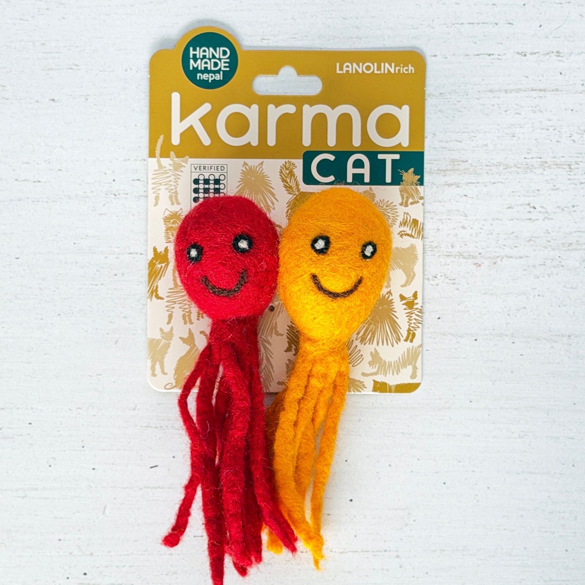 Karma Cat は、ヒマラヤとニュージーランドの厳選羊毛をブレンドした、ウールフェルト100%のねこのためのおもちゃブランドです。一般的なおもちゃでは中綿にポリエステルを使用することが多い中、Karma Cat の商品は中まで全てフェルト。ネパールの熟練職人がひとつずつ、丁寧に手作りしています。