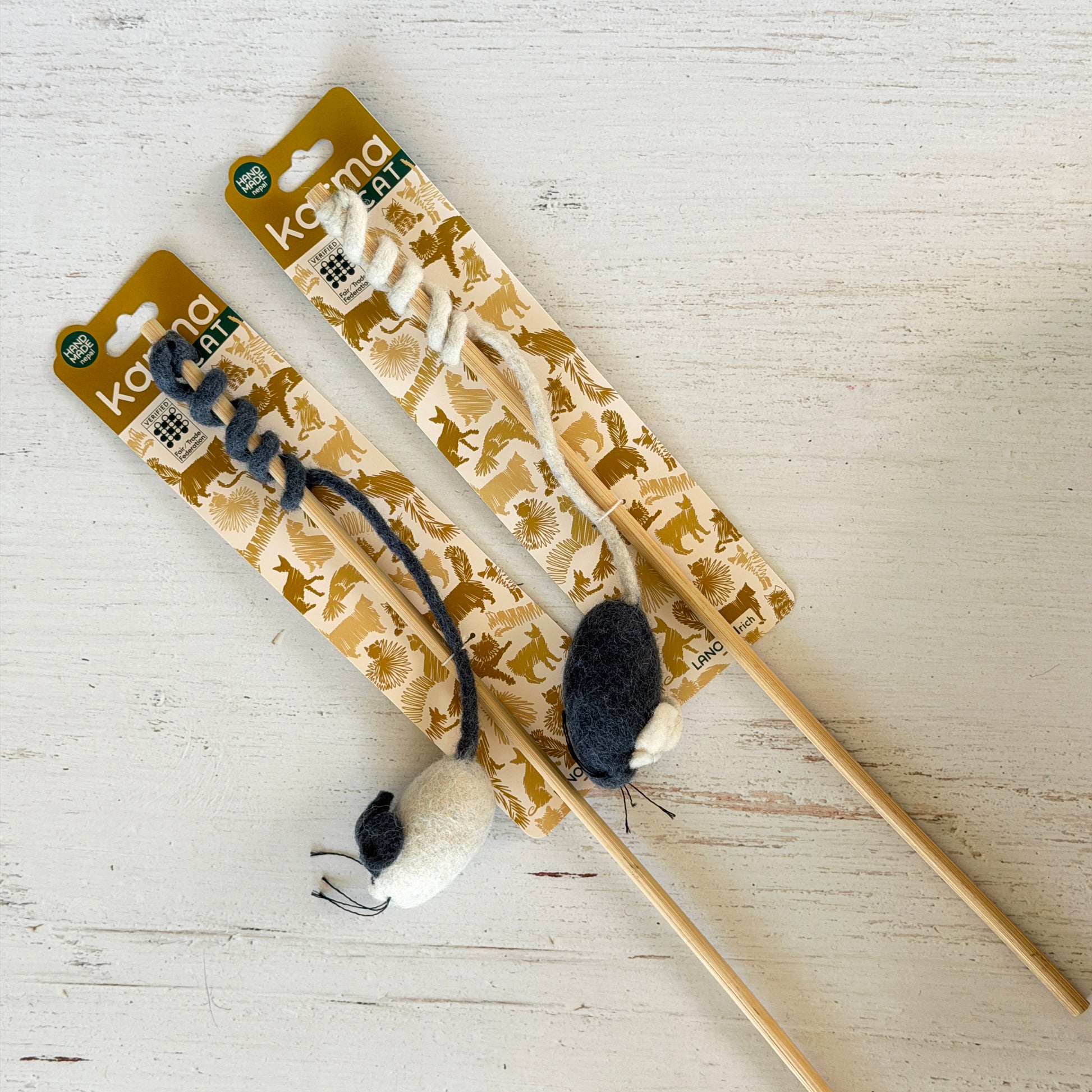 しっぽで竹に懸垂?アクロバティックなネズミの猫じゃらし。しっぽから持ち手まで、継ぎ目知らずの職人技。フェルト100%の贅沢な肉付きで、振り回すたびにダイナミックな動きを見せます。軽い竹製ハンドルで扱いやすさ抜群。