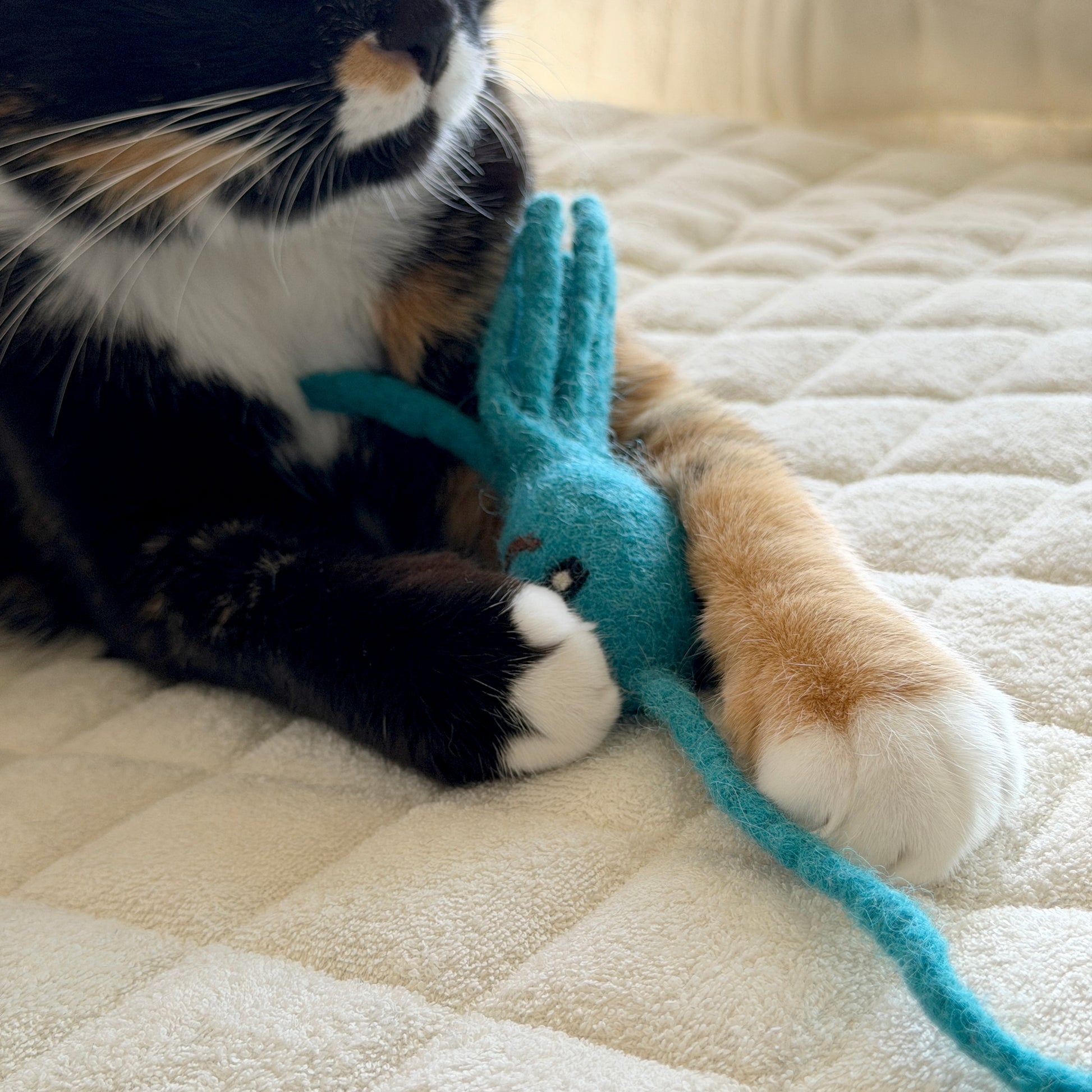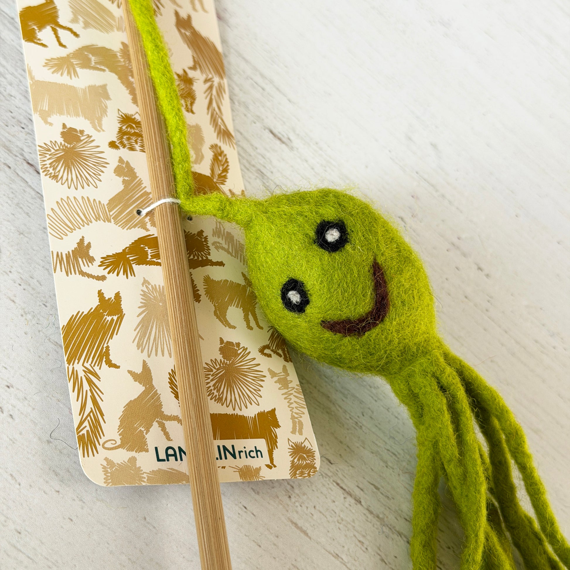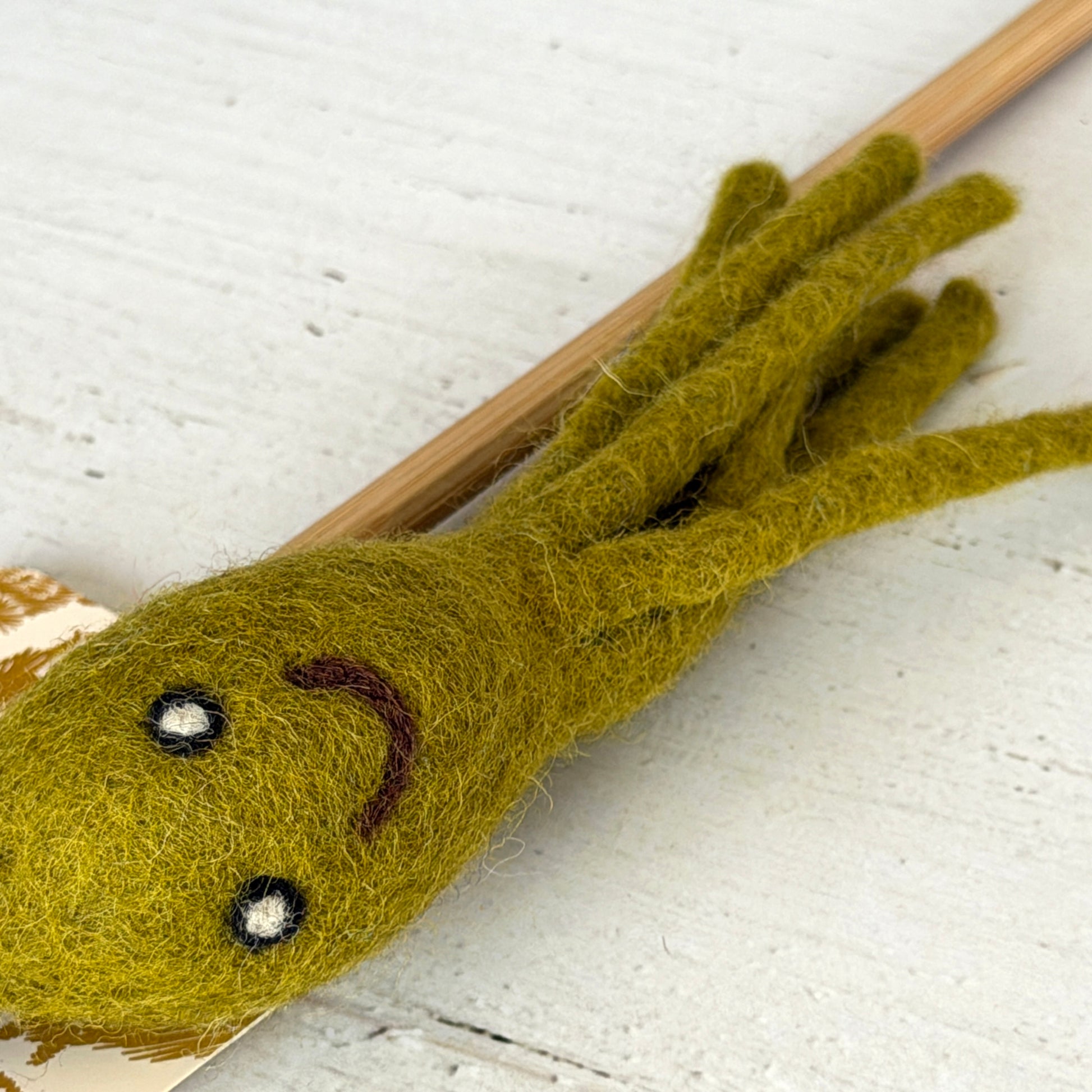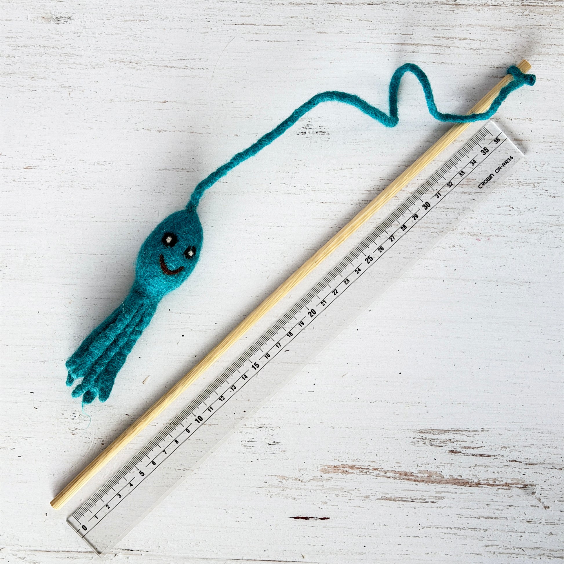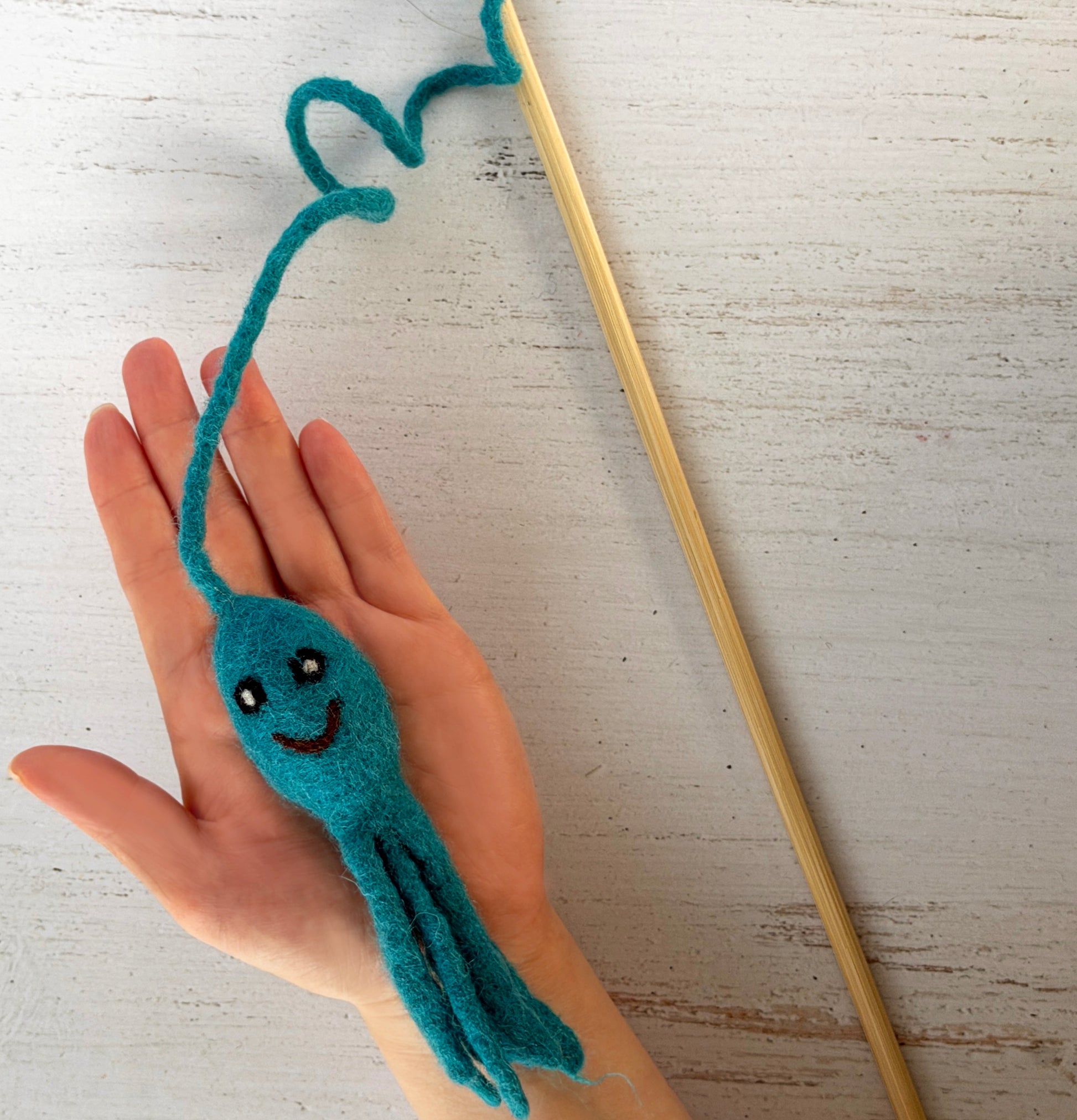 職人技光る本格猫じゃらし。タコの頭からするりと伸びる持ち手との一体感は秀逸。接着剤不使用の安心構造です。タコの中までフェルト100%の貫禄ある動きと、軽快な竹の持ち手で快適に遊べます。