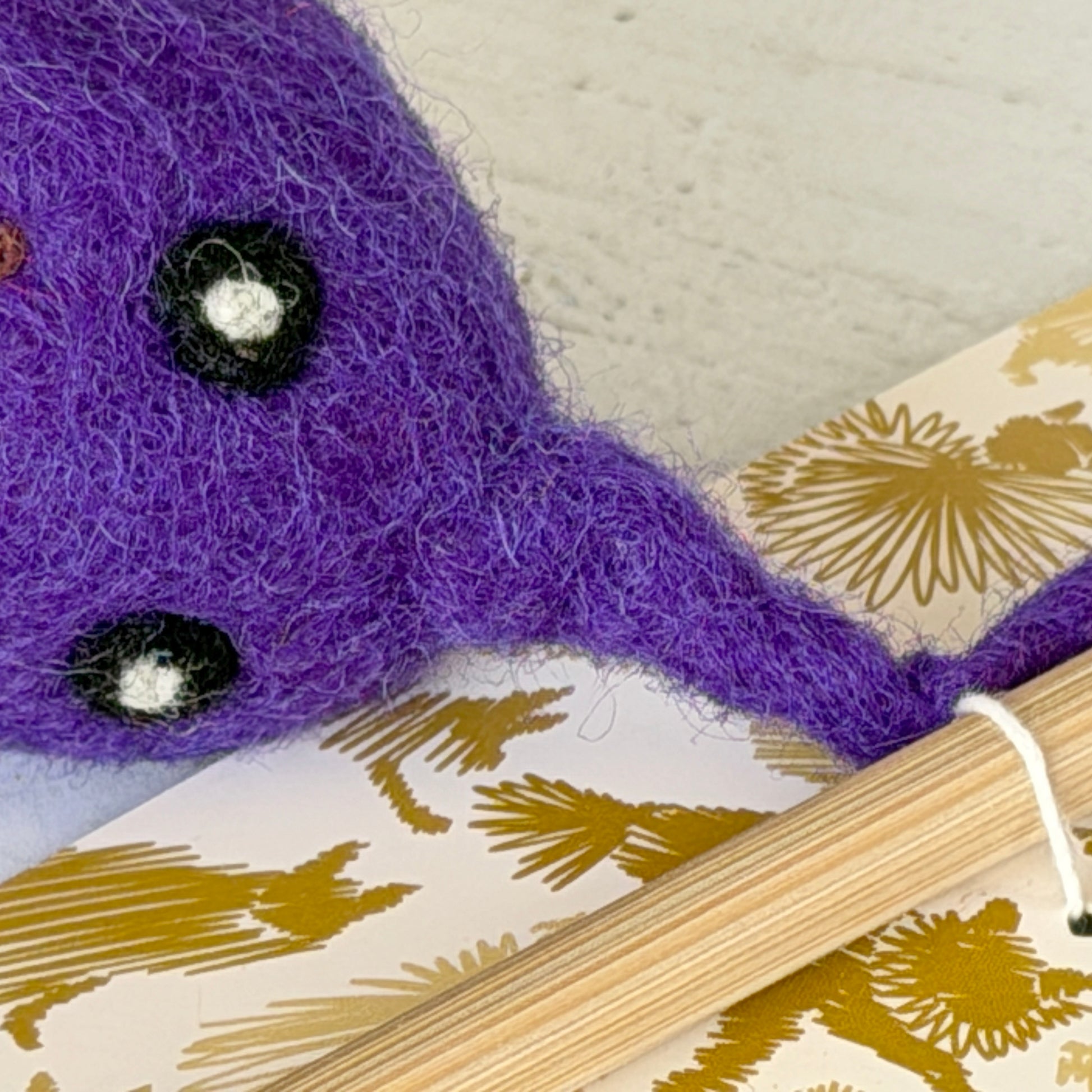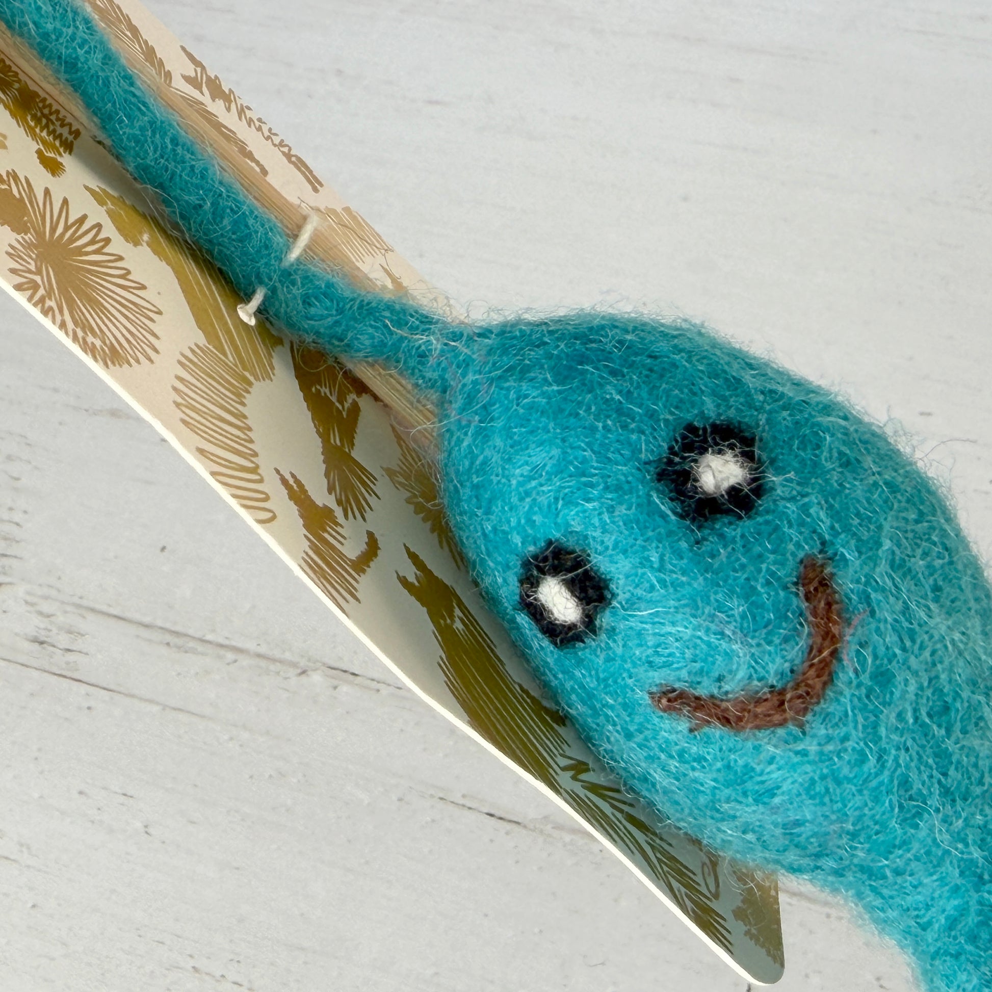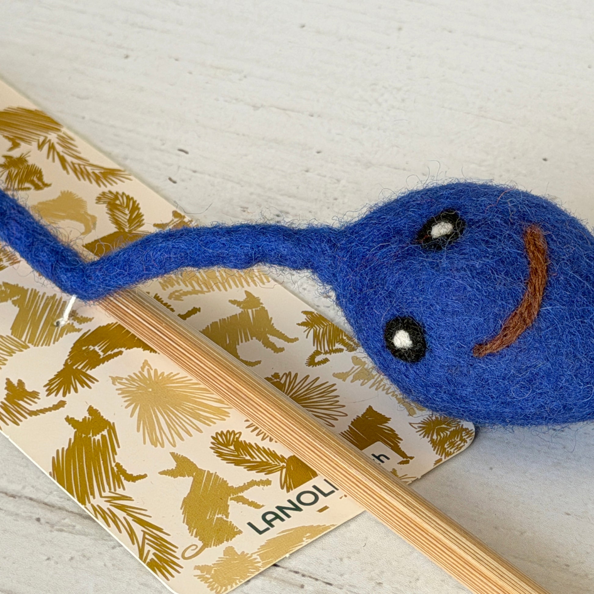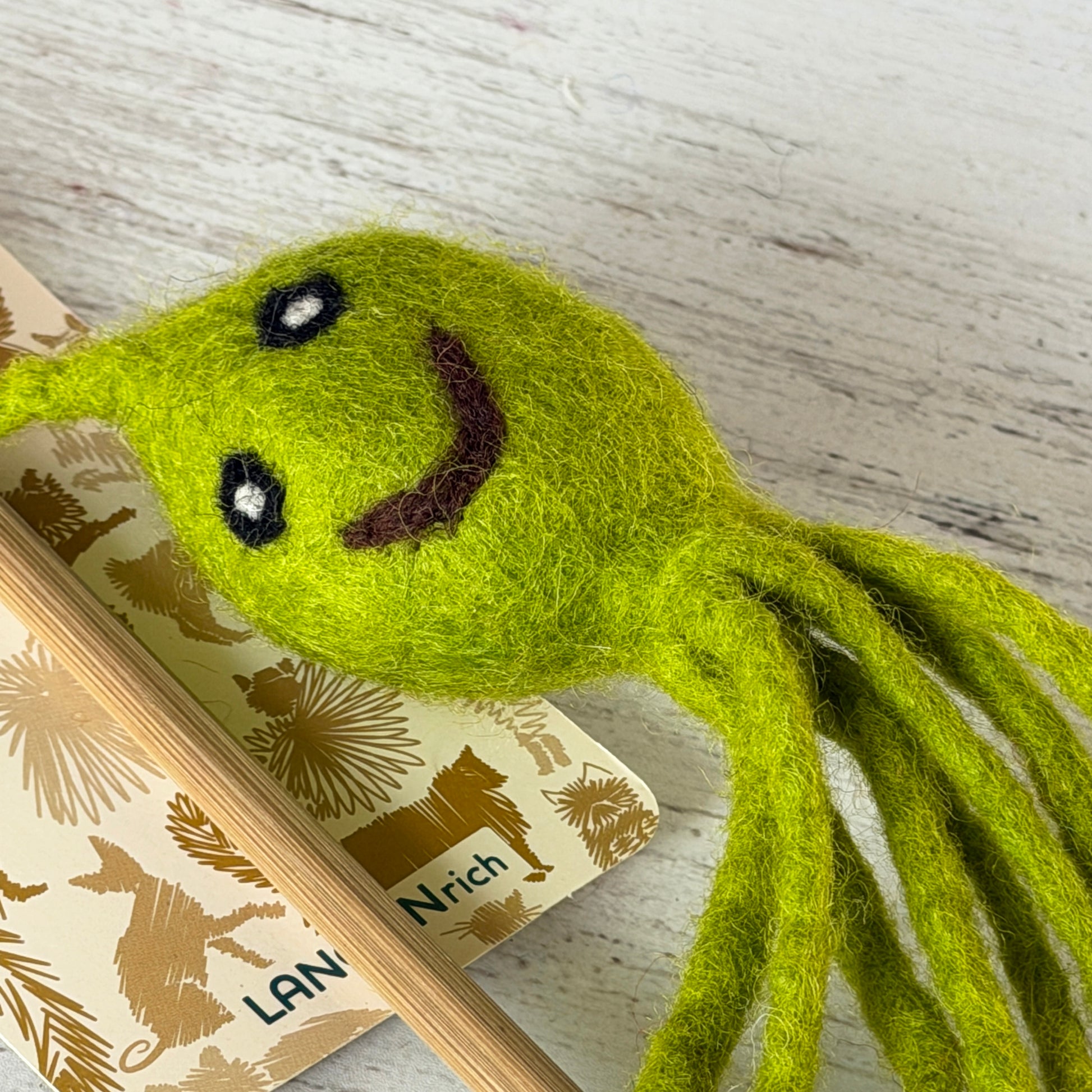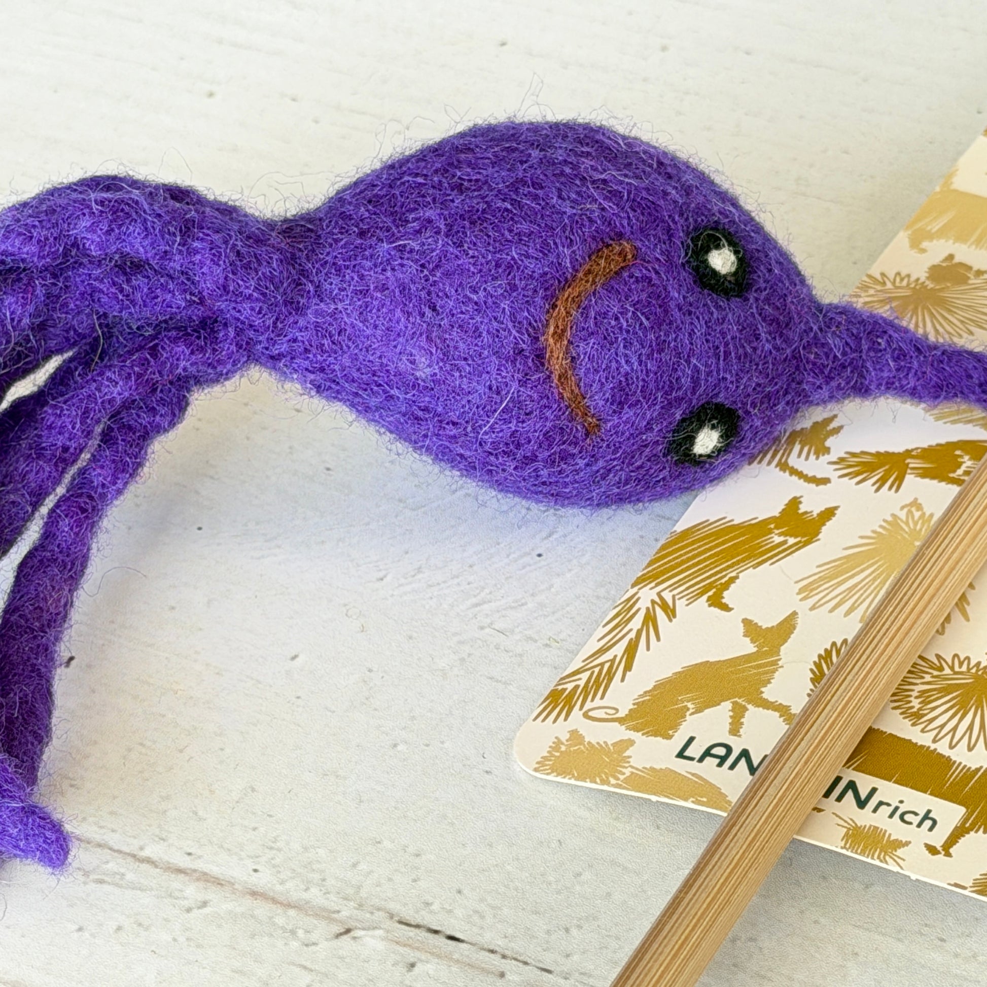 職人技光る本格猫じゃらし。タコの頭からするりと伸びる持ち手との一体感は秀逸。接着剤不使用の安心構造です。タコの中までフェルト100%の貫禄ある動きと、軽快な竹の持ち手で快適に遊べます。