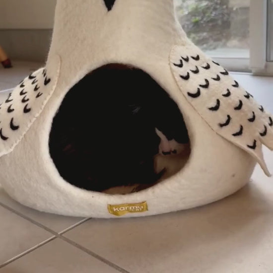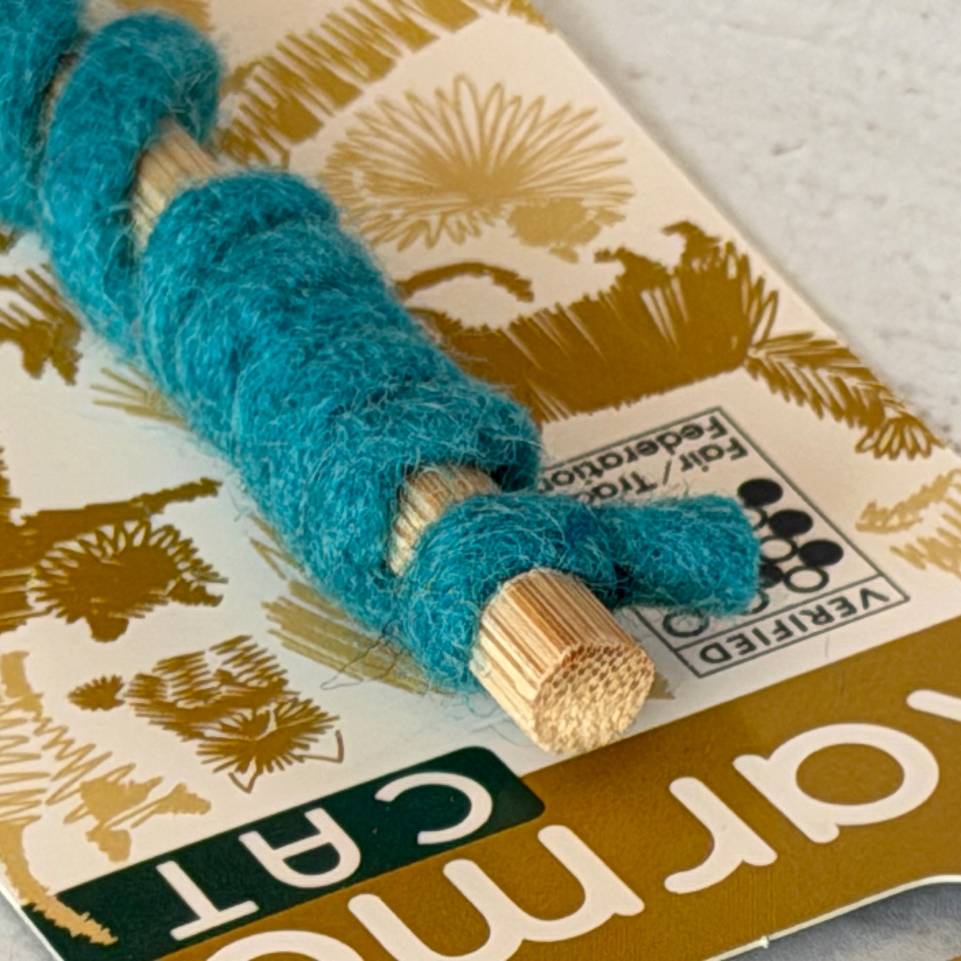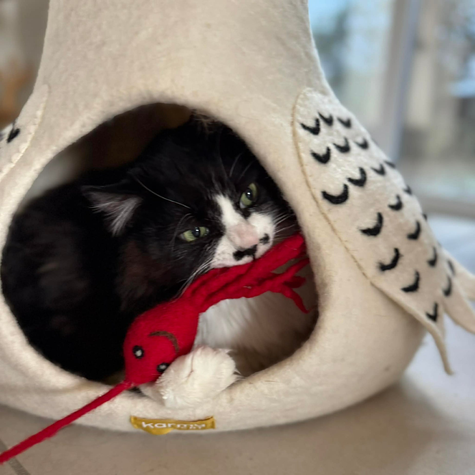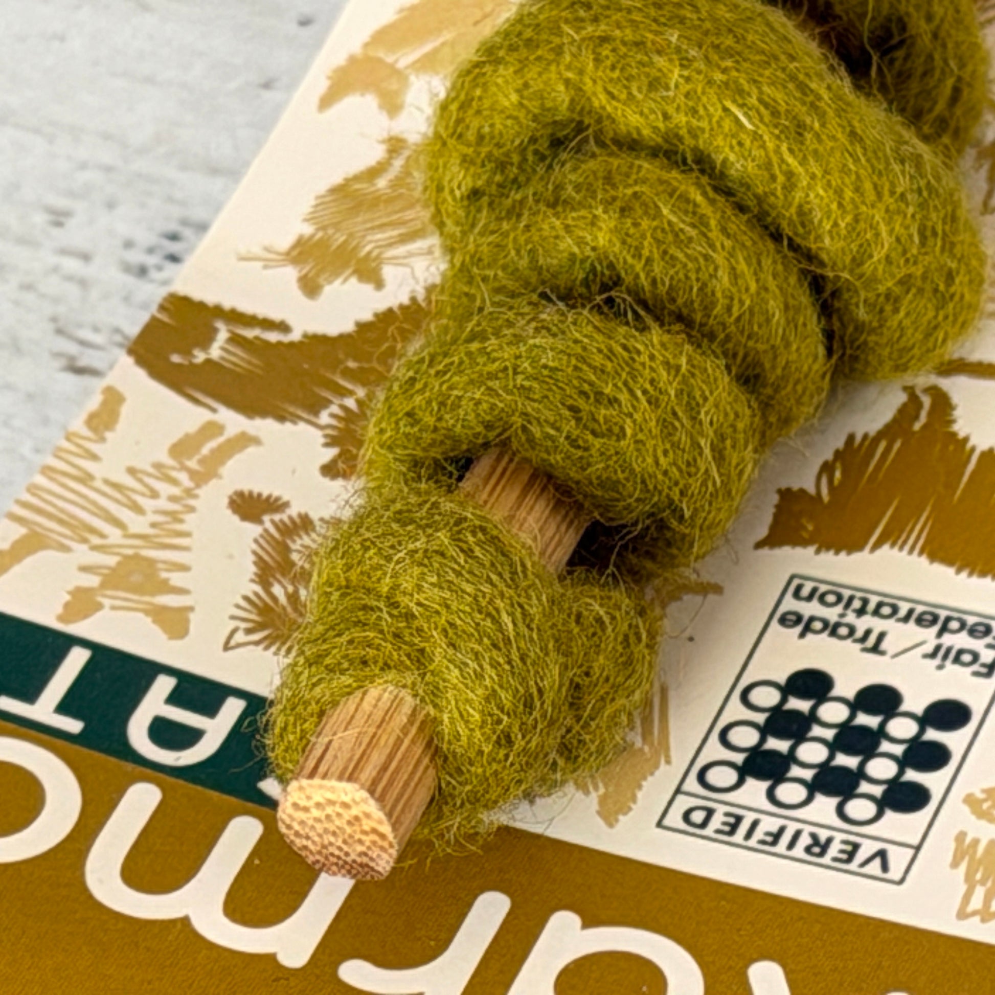 Karma Cat は、ヒマラヤとニュージーランドの厳選羊毛をブレンドした、ウールフェルト100%のねこのためのおもちゃブランドです。一般的なおもちゃでは中綿にポリエステルを使用することが多い中、Karma Cat の商品は中まで全てフェルト。ネパールの熟練職人がひとつずつ、丁寧に手作りしています。