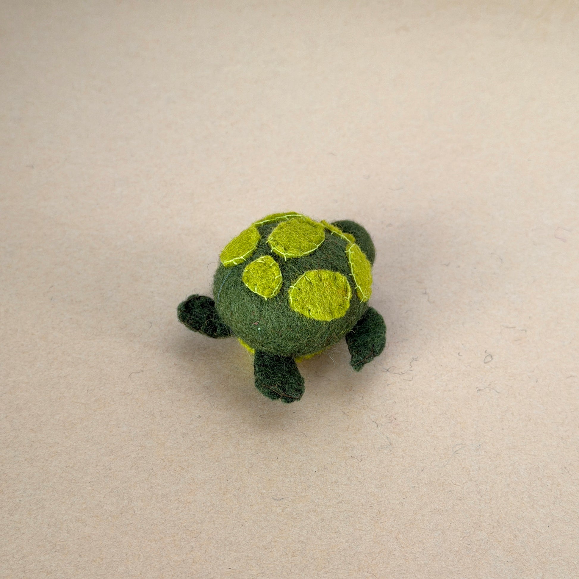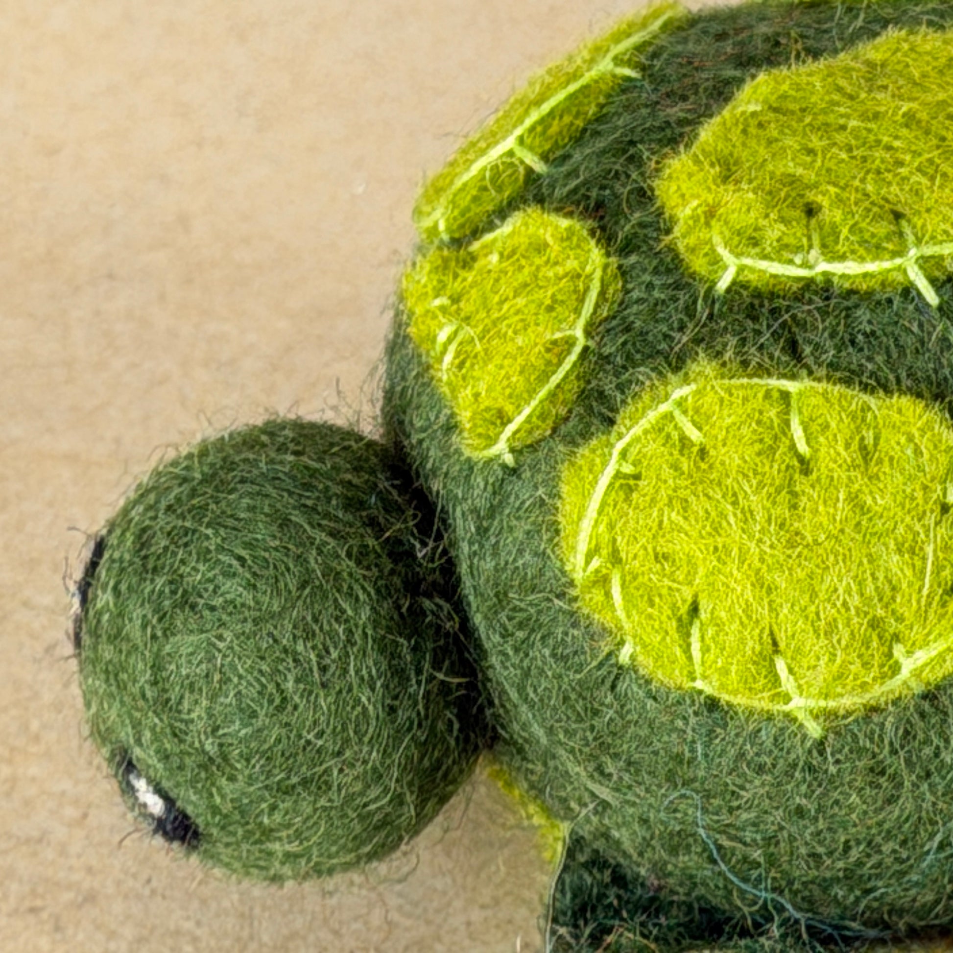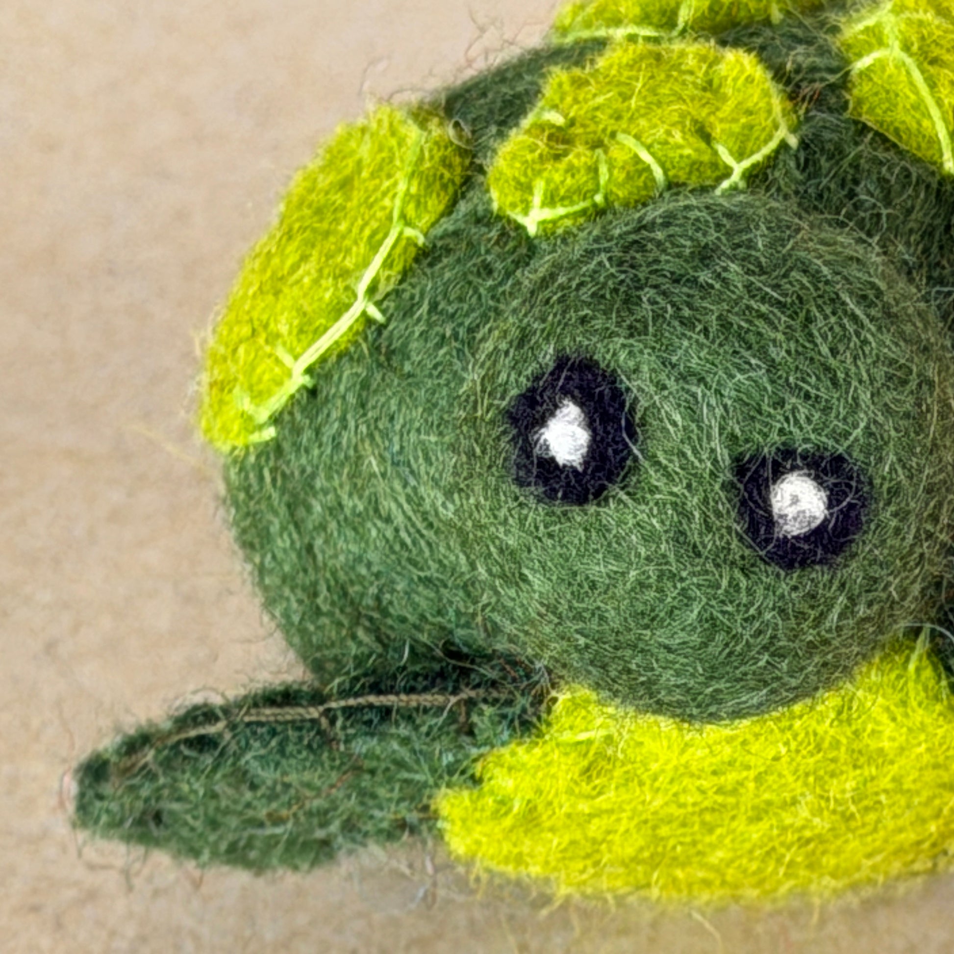 マイペースに泳ぐ、甲羅自慢のカメ。愛らしい丸甲羅に、職人の手縫いが光る模様付き。上を向いて泳ぐのは得意だけど、ひっくり返ると困ってしまいます。